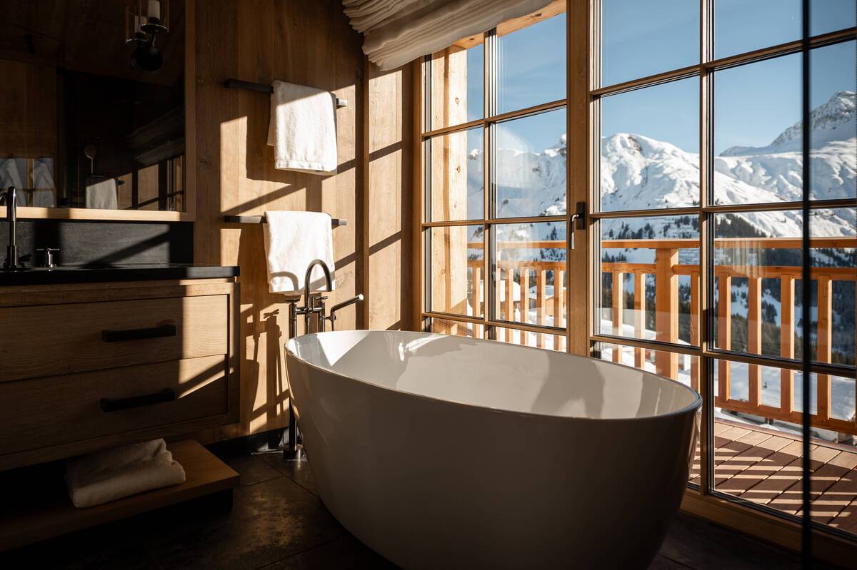 The large sitting room has been meticulously interior designed and offers a northern chic meets alpine luxury style. The property comes with housekeeping staff (twice a day), your own butler and private chef. Delicious breakfasts, afternoon teas and dinners are prepared to meet your own states. Your chef will provide dinners which can be from a fixed menu, a la carte, table buffet family-style or a themed evening with fondue or raclette.