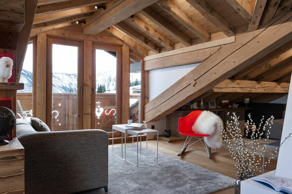 Apartment Le M 1850 is a three bedroomed property on the top floor of the popular Marmottes Residence near the centre of Courchevel 1850. The sitting room has lovely east facing views over the rooftops of the resort and looking towards the Dent du Villard Mountain.