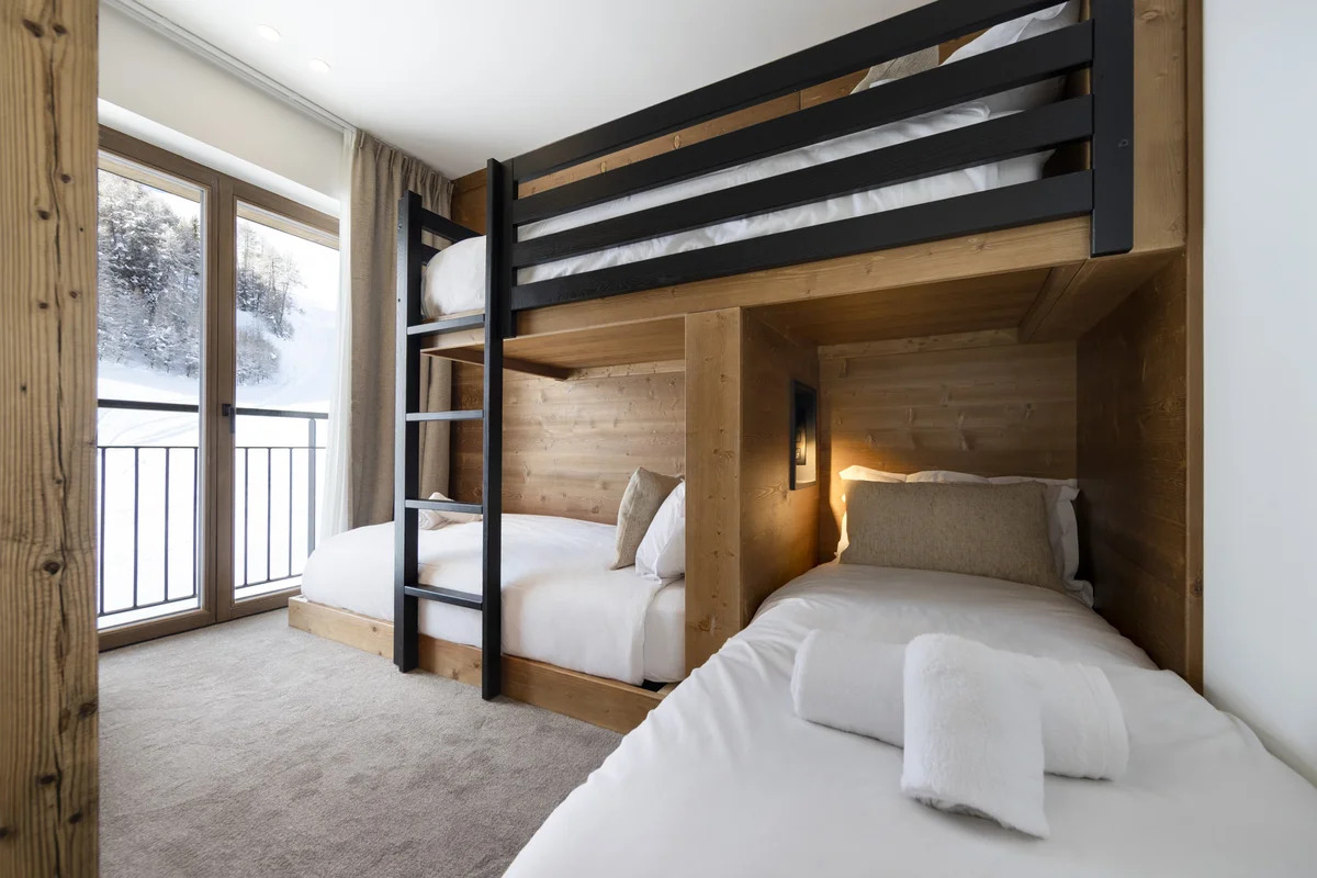 The Monte Rosa Suite sleeps from 6-9 guests and has two bedrooms with double or twin beds and en-suite shower room, and a family suite with double or twin beds, private bathroom, and separate kids room with full sized bunk beds and a single bed.