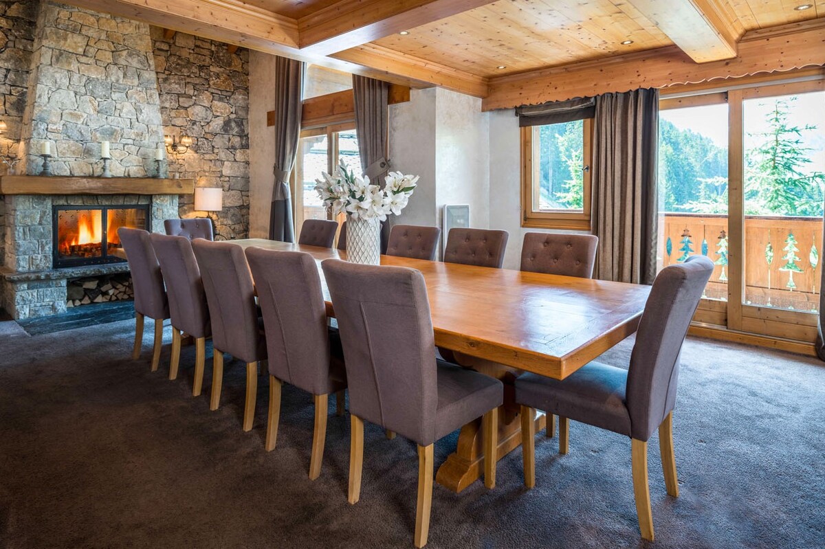 Built in traditional Savoyard style to the highest specifications, the chalet offers accommodation over three floors. The centre-piece of the chalet is an expansive south facing living room featuring luxurious sofas, an open log fireplace, HD satellite & terrestrial television and surround sound music systems. The equally impressive south facing dining room features a magnificent oak dining table complimented by a floor to ceiling fireplace.