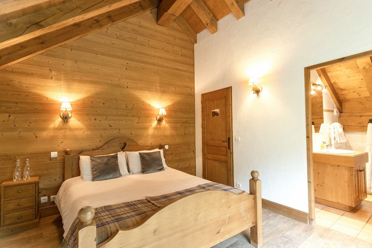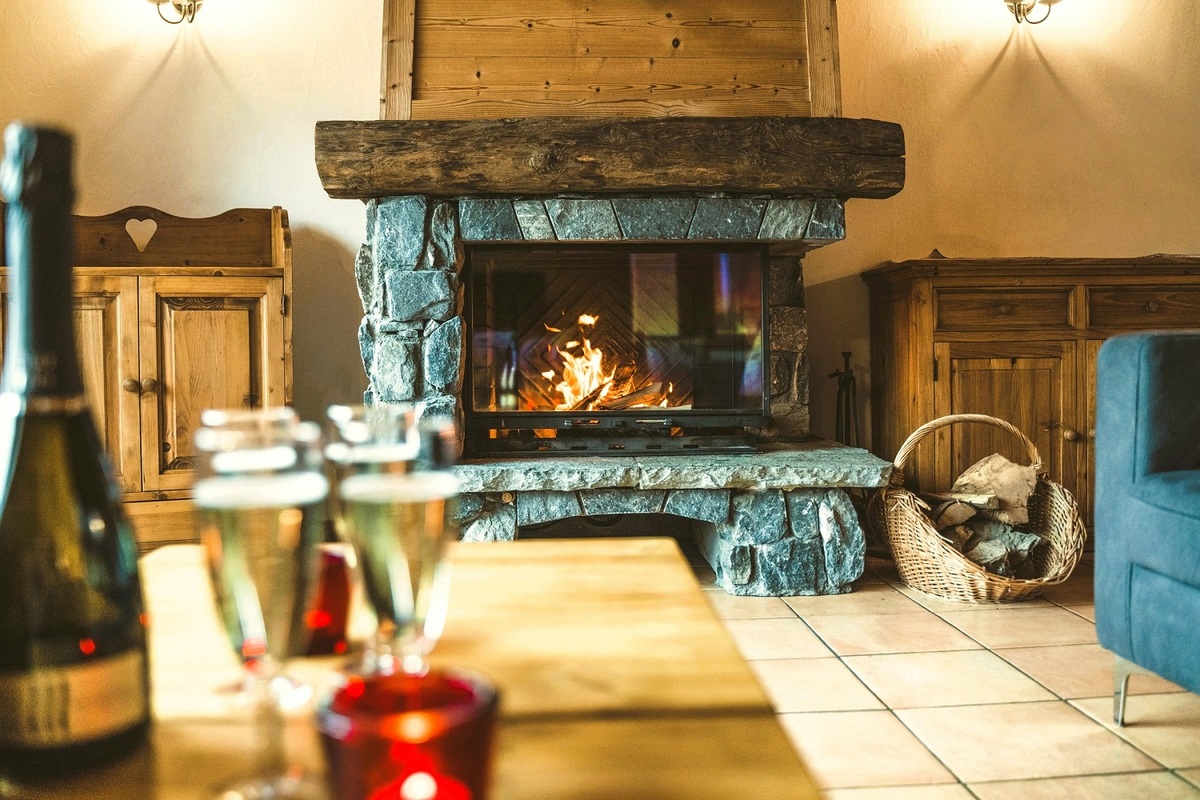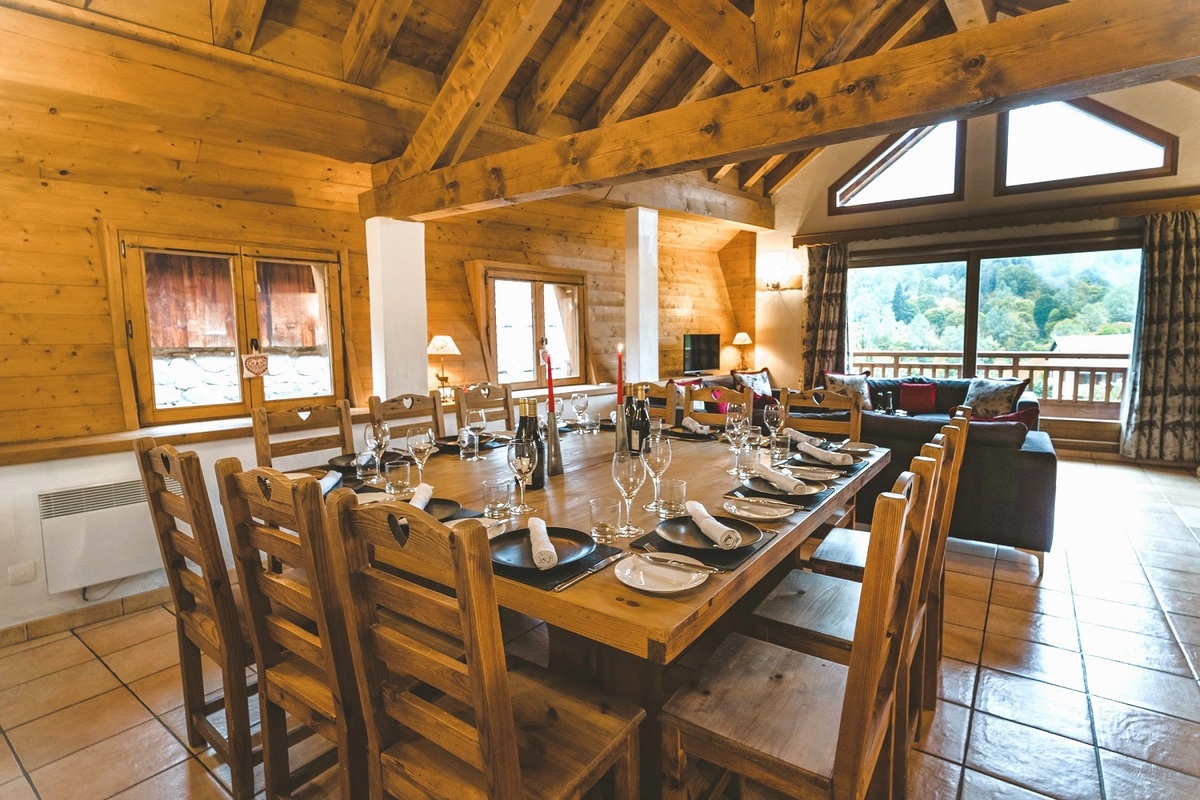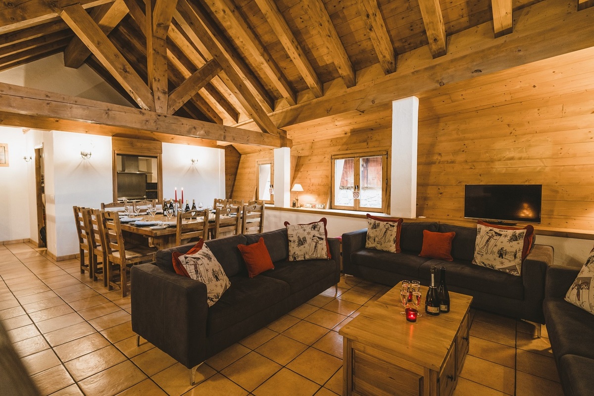 The chalet boasts a spacious, open-plan living and dining area where you can relax and unwind after a long day of skiing on comfortable sofas in front of an open log fire. Through the living room windows, you will be treated to spectacular views looking towards the Tougnete and Saulire peaks.