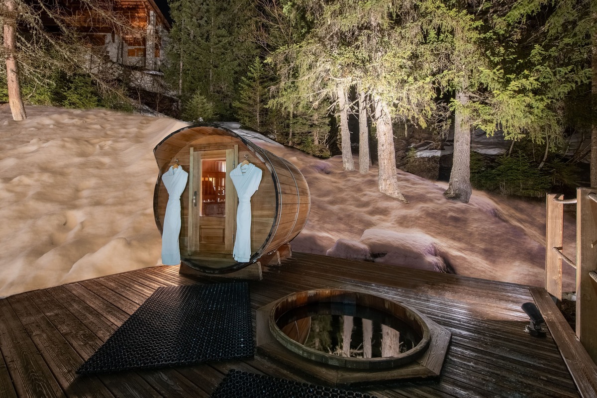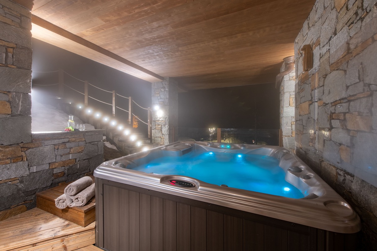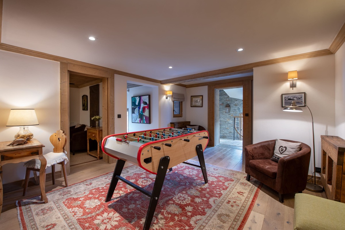 The first floor has the incredible private spa and wellness area. There is a wonderful hammam and after skiing your chalet host can arrange a professional massage in the peace and privacy of your own treatment room. On the terraces accessed from the first floor there is an outdoor hot tub, barrel sauna and also a plunge pool. The fire-pit with seating gives guests an unforgettable view across the valley and is the perfect spot to toast some marshmallows and watch the sun go down. Also on this floor is the cinema room which has Apple TV, a DVD library, French, Russian and UK satellite TV. There is also a separate games room with table football.