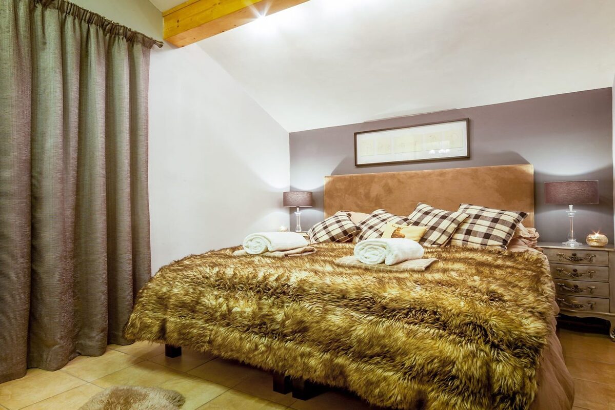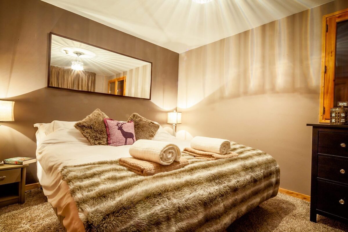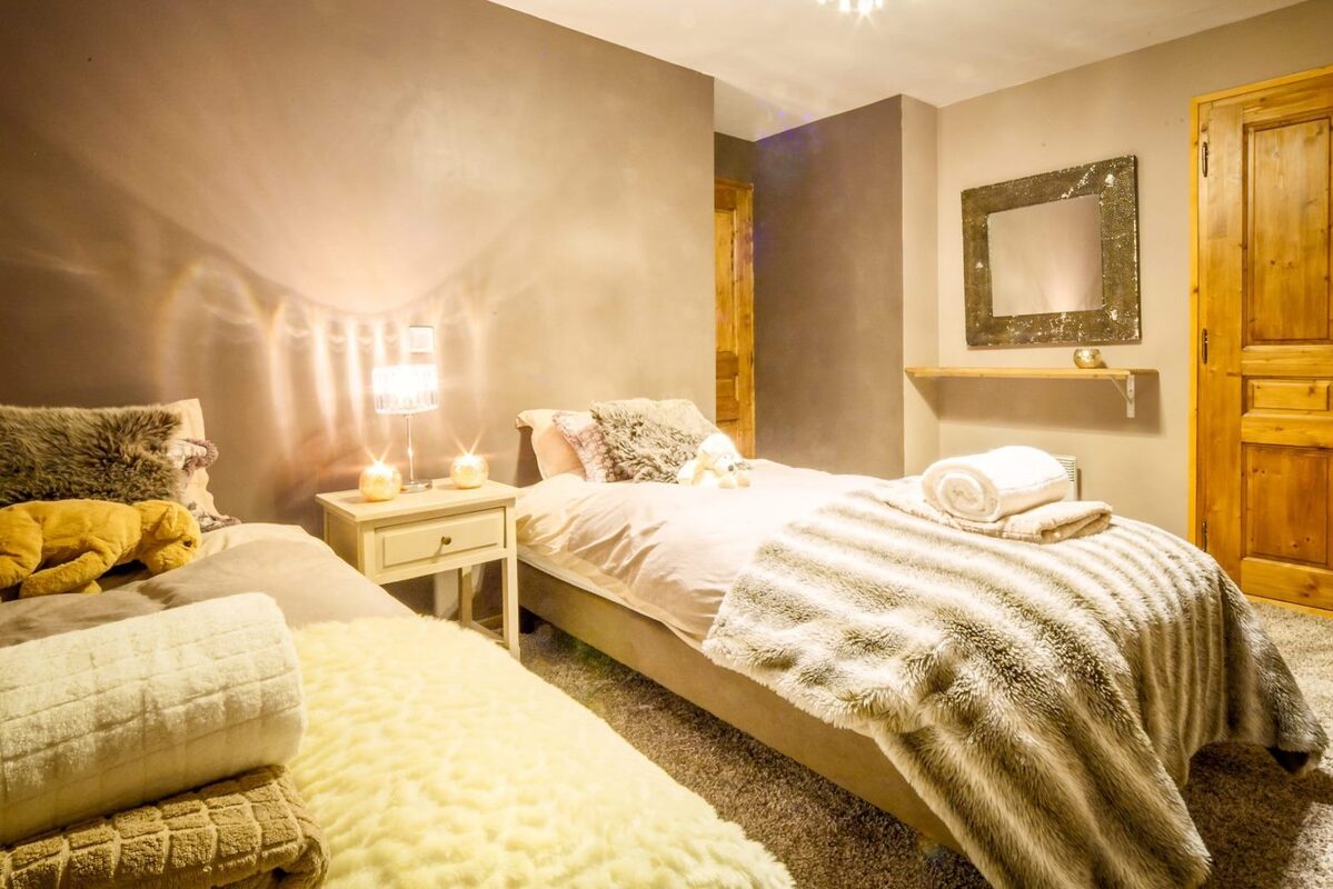 The chalet has 6 bedrooms and sleeps up to 12 people. Four of the bedrooms have their own bath/shower facilities and two bedrooms on the ground floor have a large bathroom and separate WC shared between them.