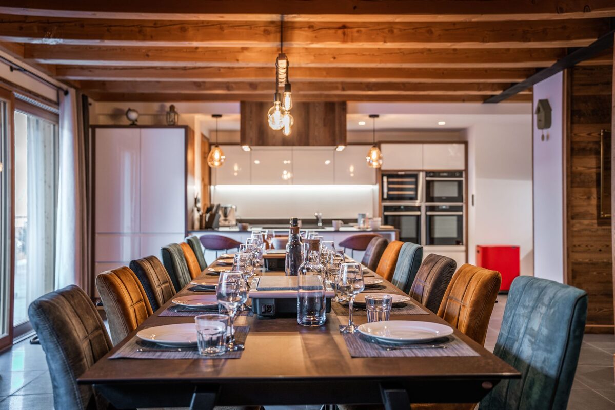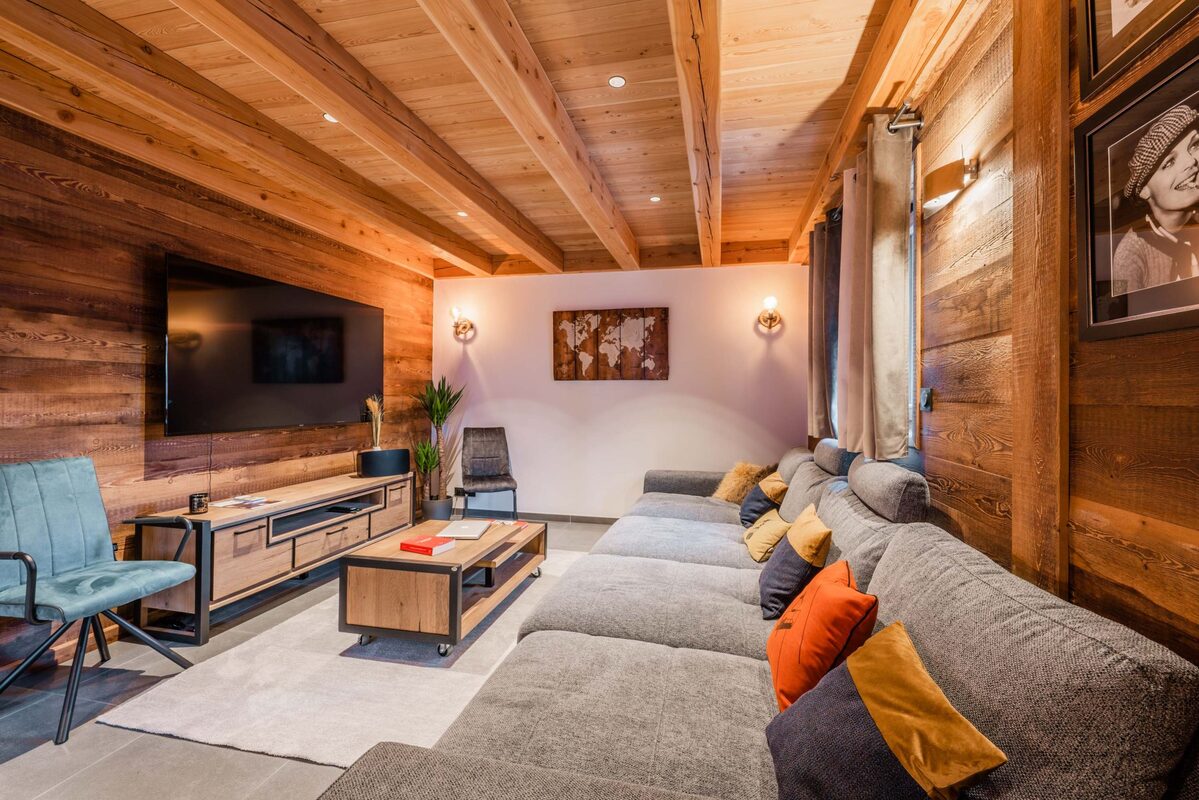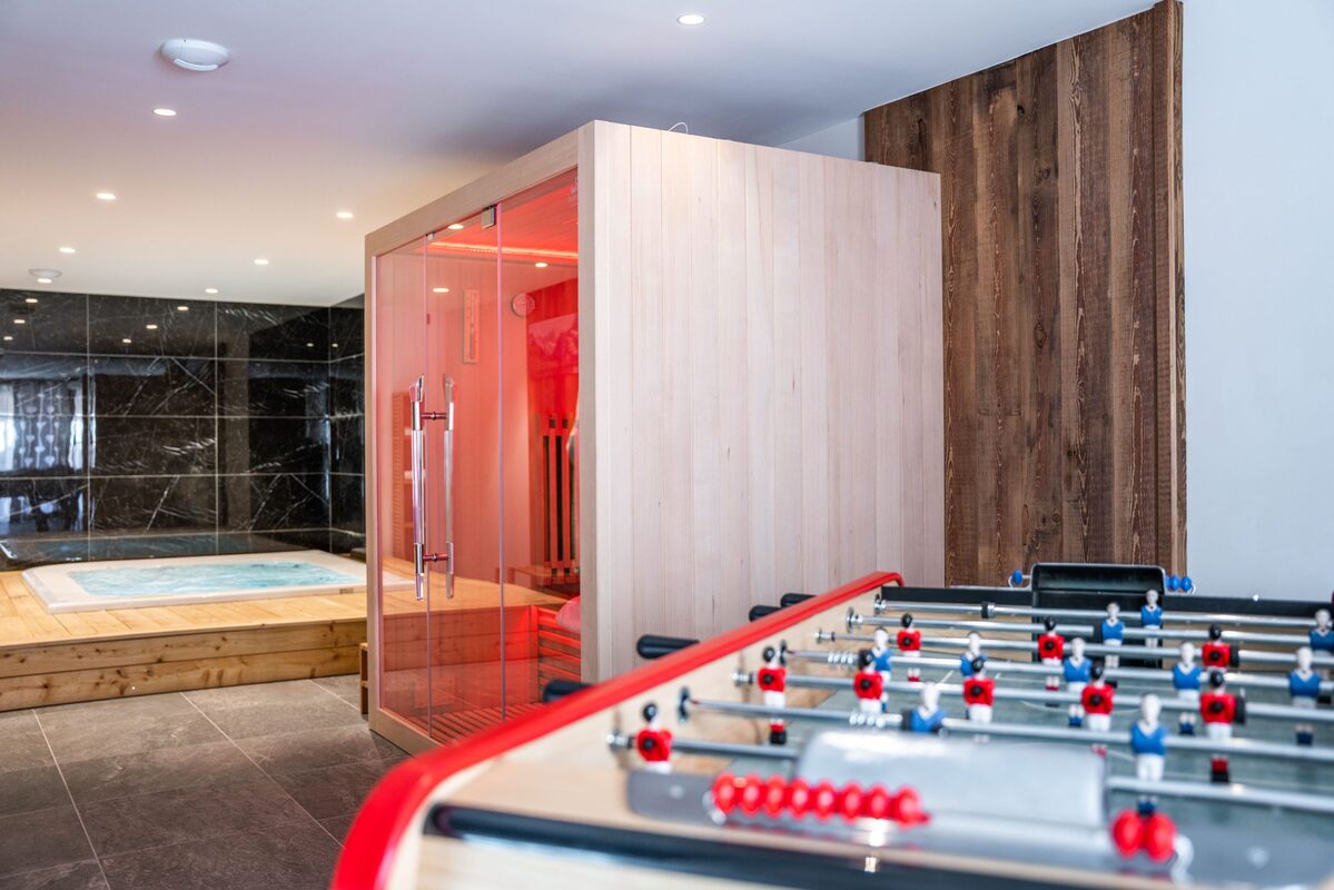 Guests will appreciate the chalet's amenities, including a professional-grade open-plan kitchen, wellness area with infrared sauna and hot tub, and table football.