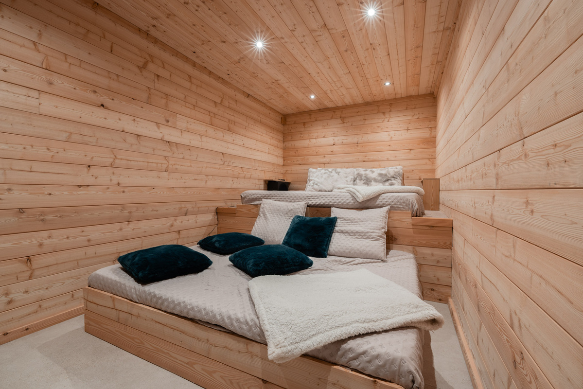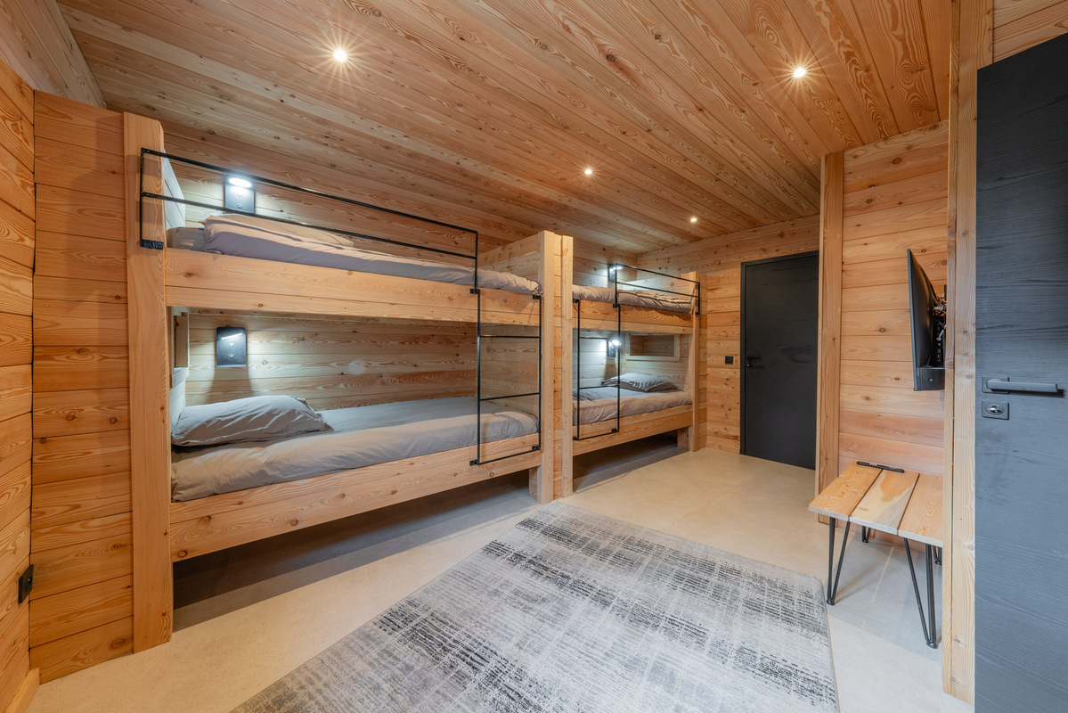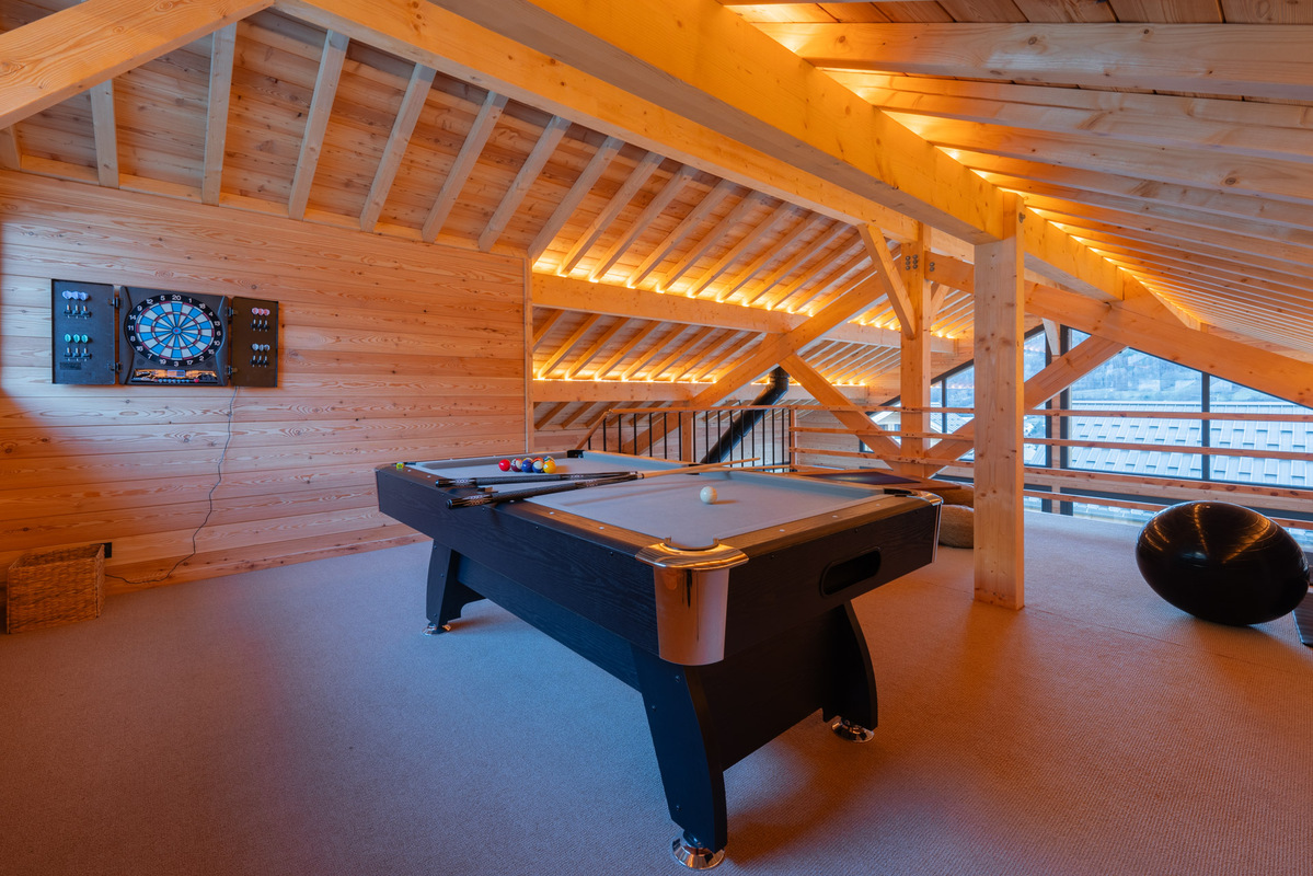 The chalet is laid out across three levels. The garden level houses three elegant double bedrooms, each with its own ensuite shower room, and a room with two bunk beds and a private bathroom. The ground floor offers a boot room, a fully equipped kitchen, a spacious lounge and dining area with a fireplace, and access to the terrace and outdoor hot tub. The mezzanine hosts the pool table.