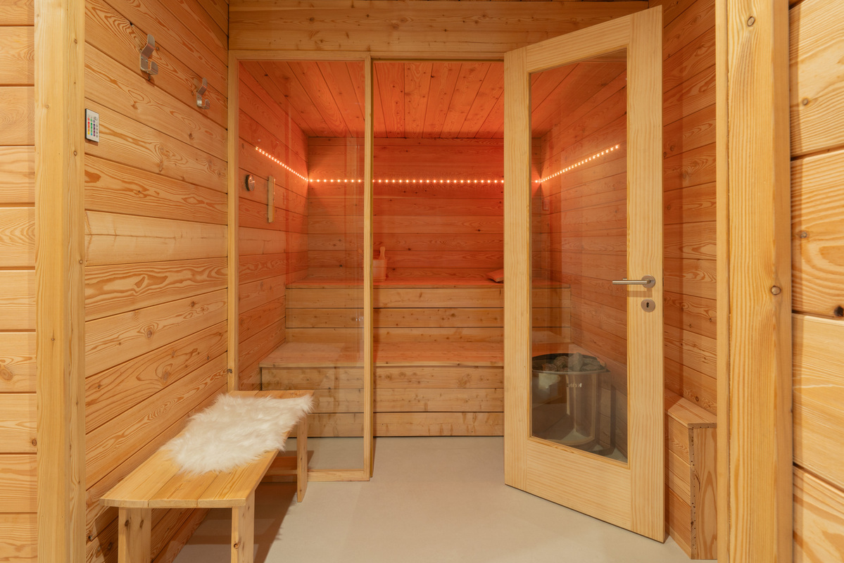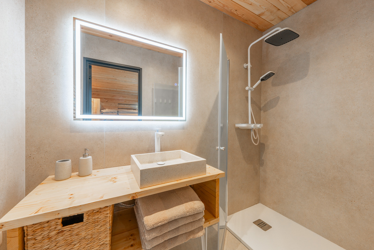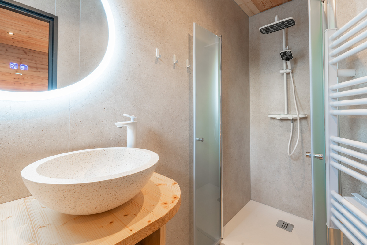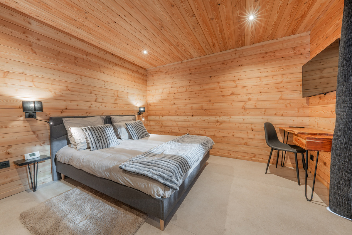 The chalet is laid out across three levels. The garden level houses three elegant double bedrooms, each with its own ensuite shower room, and a room with two bunk beds and a private bathroom. The ground floor offers a boot room, a fully equipped kitchen, a spacious lounge and dining area with a fireplace, and access to the terrace and outdoor hot tub. The mezzanine hosts the pool table.