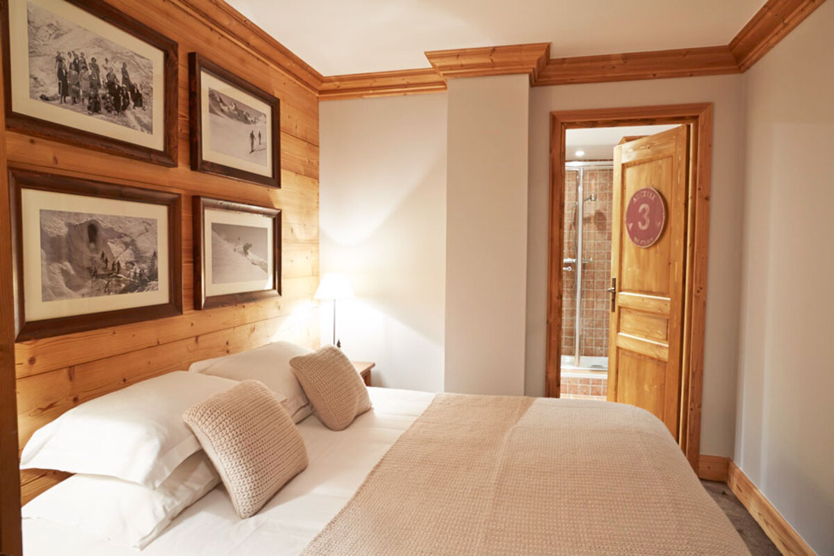 Bedroom 4 is a double bedroom with a flat screen TV and DVD player. The room is en-suite with a shower, sink and WC. There is also a balcony looking across towards the village of Val d'Isere.