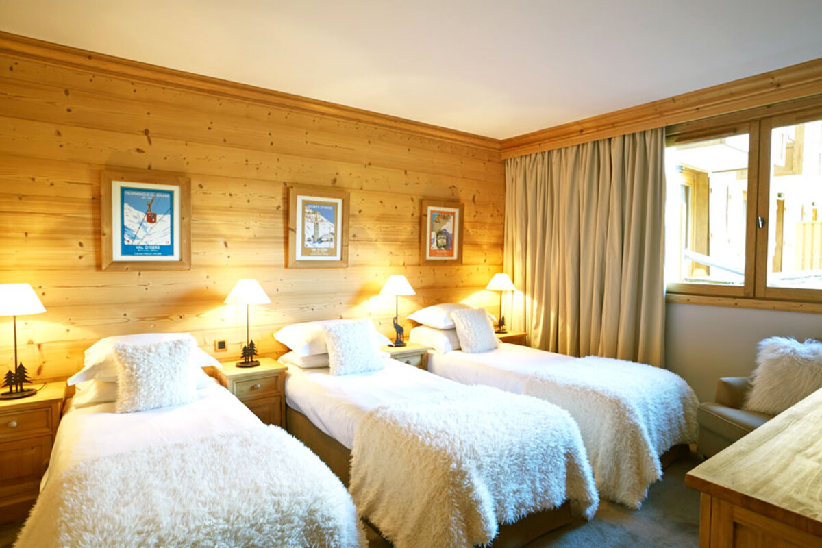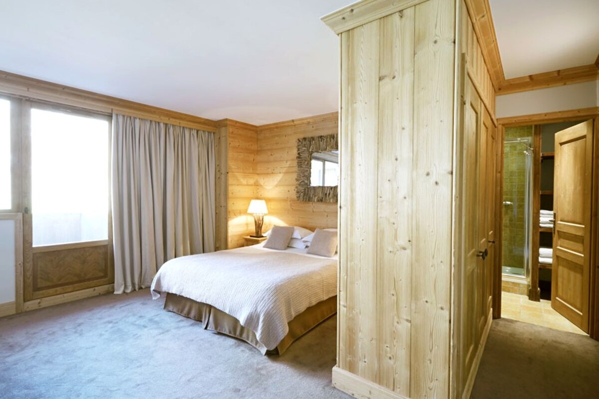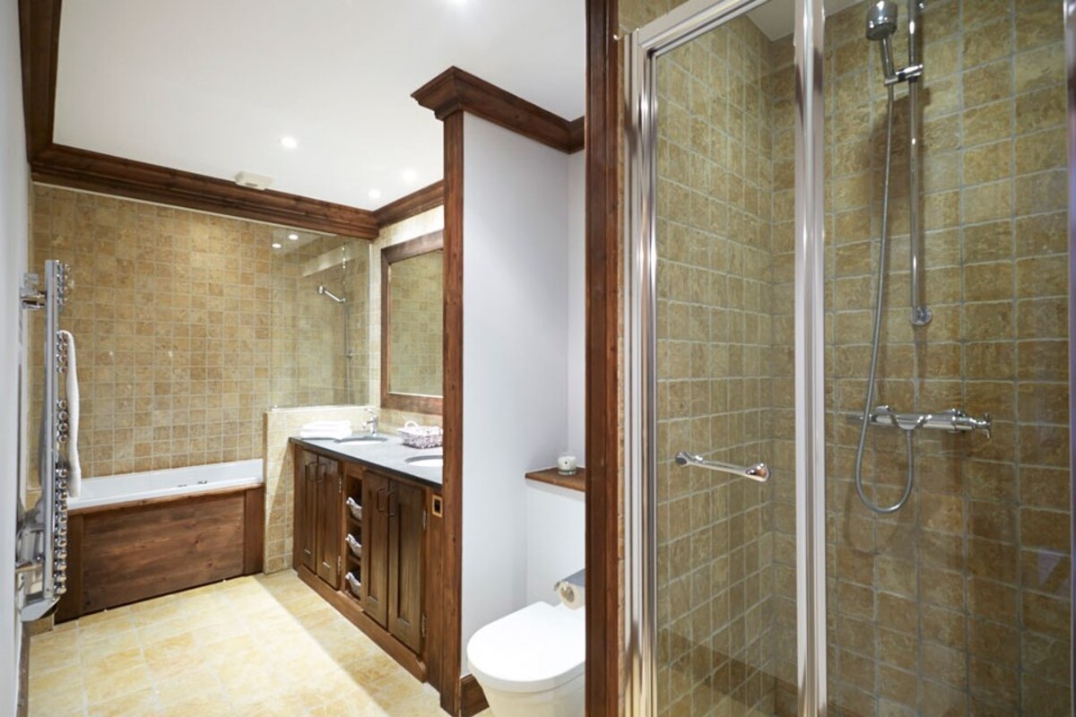 Chalet 107 Aquila is split over two floors. The first three bedrooms are on the first floor as you enter the apartment. The Master Suite is a spacious bedroom with bedside tables, chest of drawers, built in wardrooms and a dressing table. There is an en-suite bathroom with a full size bath and double sinks as well as a separate shower in the opposite corner. The bedroom also has a large flat-screen TV and DVD player.