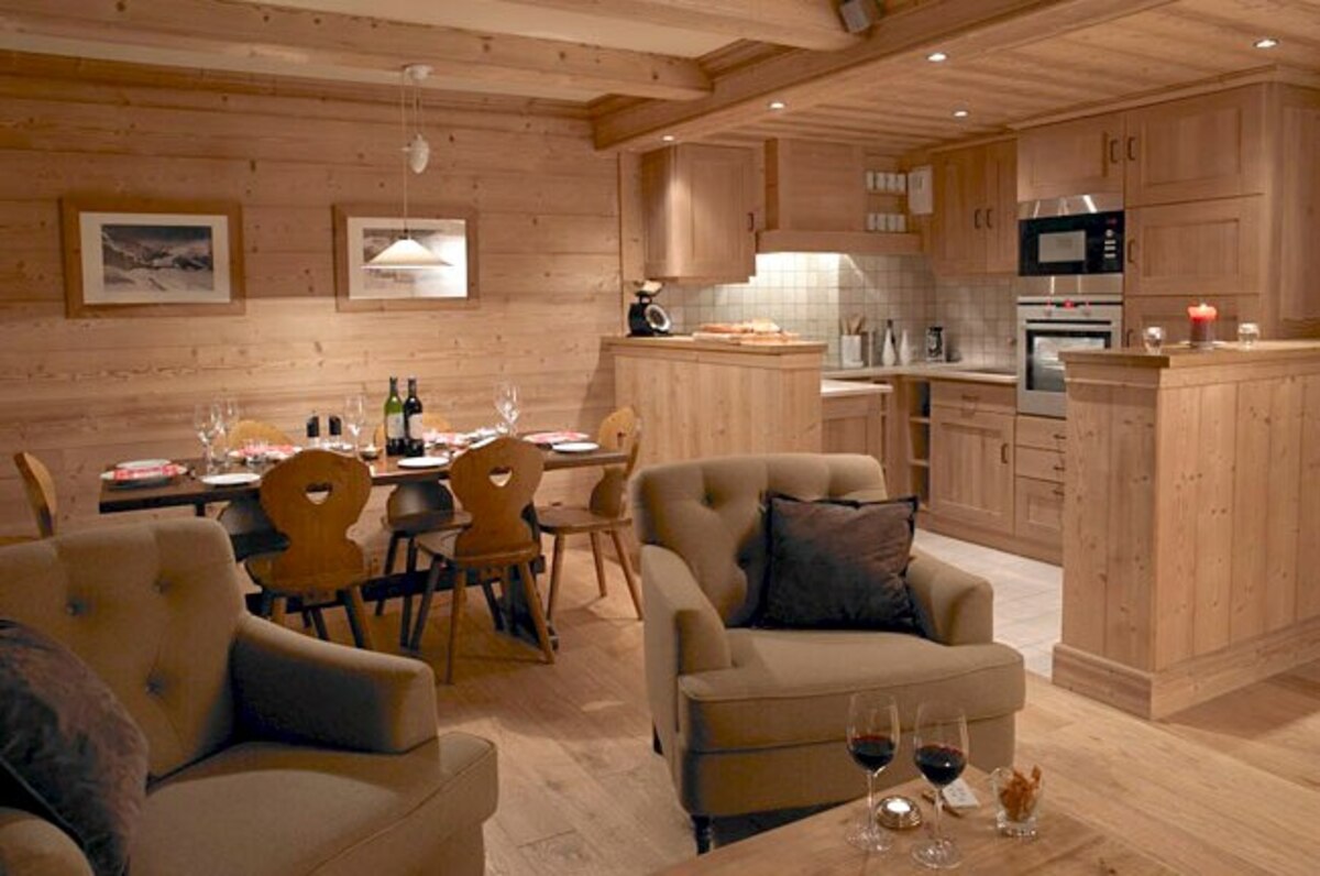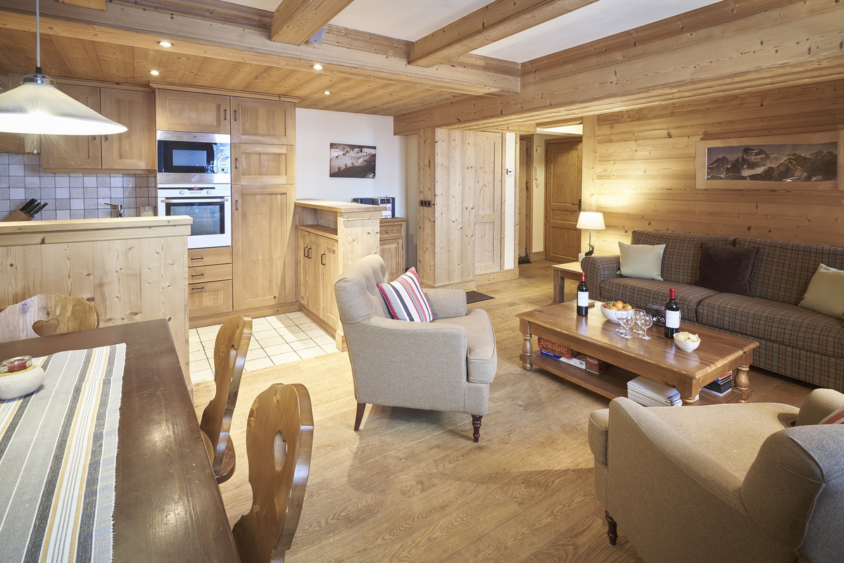 Chalet 203 Aquila covers 2 floors; the entrance to the apartment is on the lower floor and leads into the open plan sitting room on one side and the dining area on the other side. The living and dining are both sit 6 people comfortably. The chalet is equipped with a modern kitchen that has a 4 ring hob, normal size oven, microwave, kettle, toaster & dishwasher.