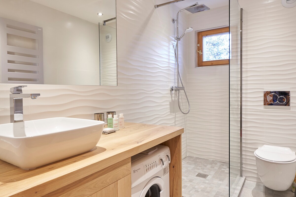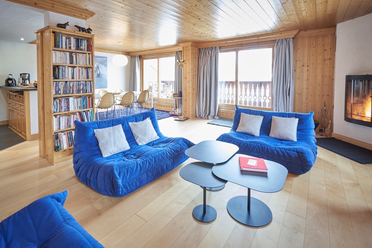 The hallway has a ski boot dryer, racks for boots and a cupboard for ski jackets. It is 100sq m so offers space and comfort. It has very spacious open plan living accommodation with three sofas, 2 leather chairs, large French flat screen TV, DVD and the fireplace to enhance the atmosphere. The dining area and kitchen are on the other side of the open plan layout.