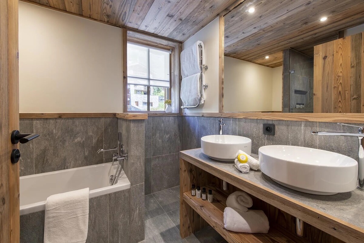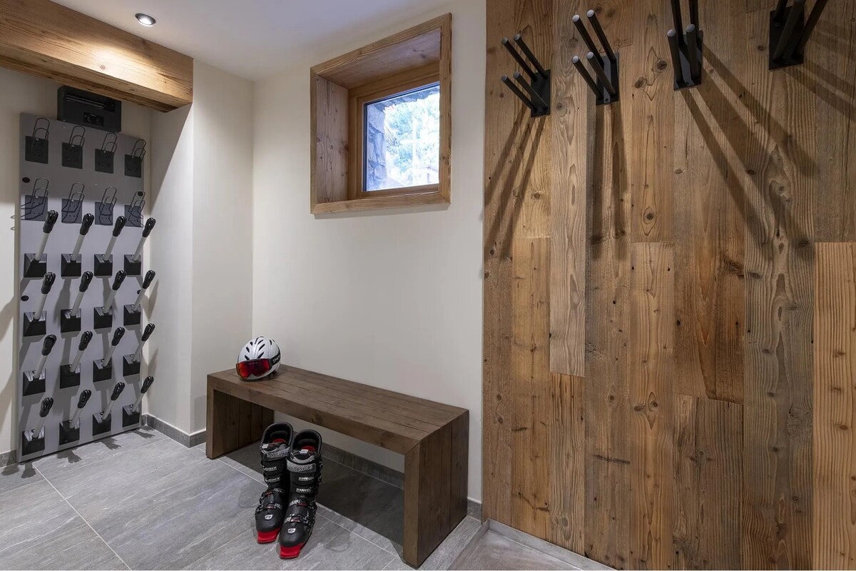 Practical amenities enhance the experience: a private ski room with heated boot warmers is conveniently located by the chalet entrance, and three secure underground parking spaces, accessible via the lift, provide easy access for guests arriving by car.