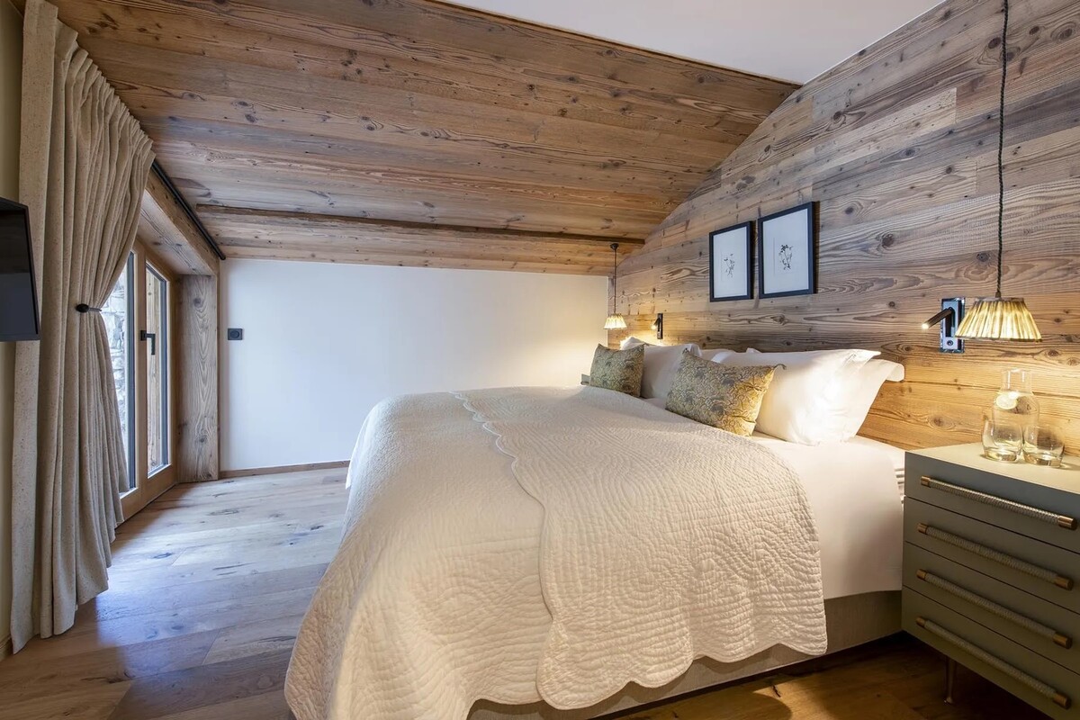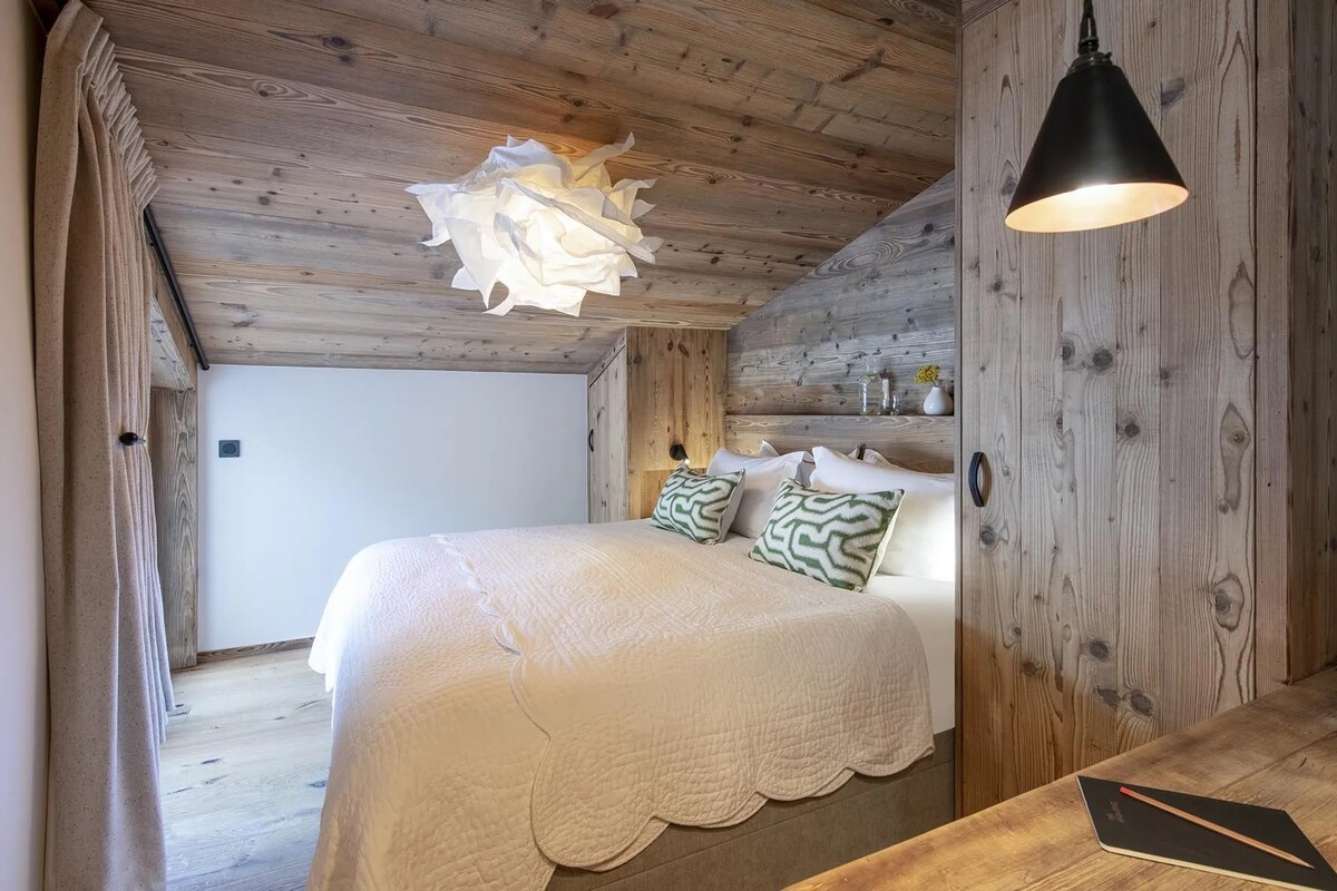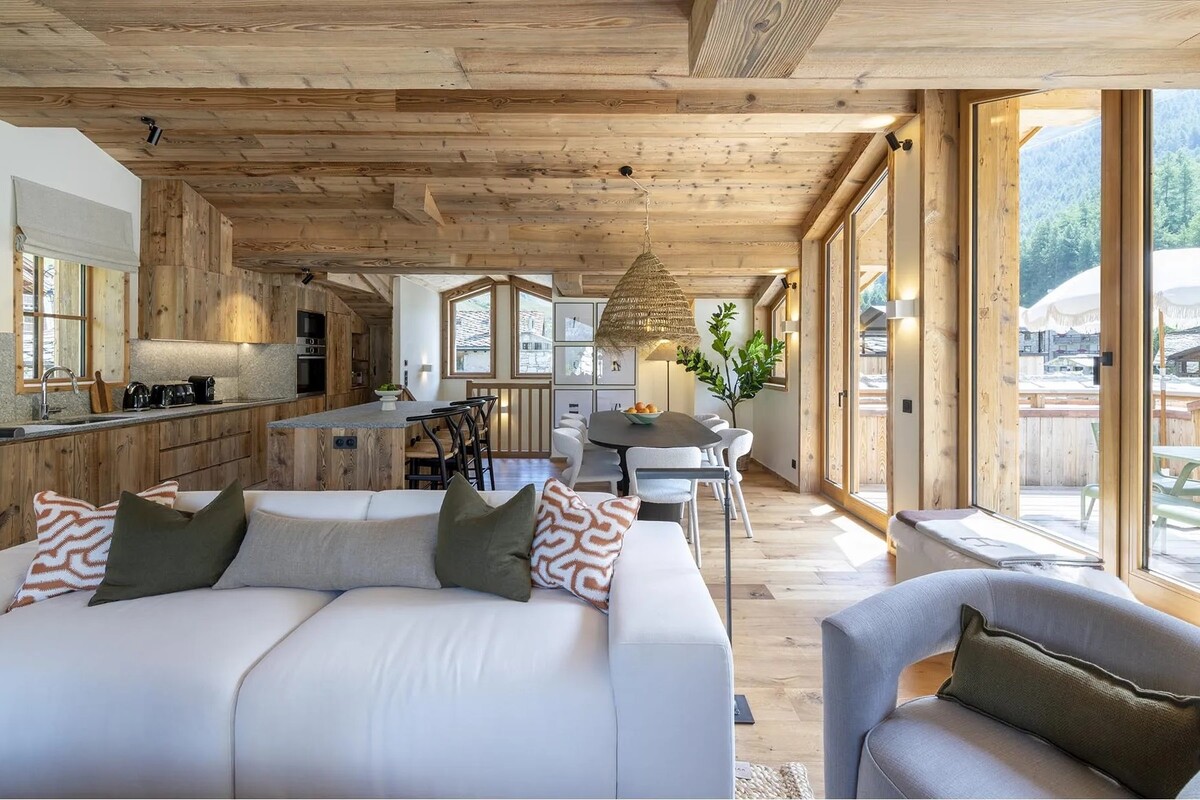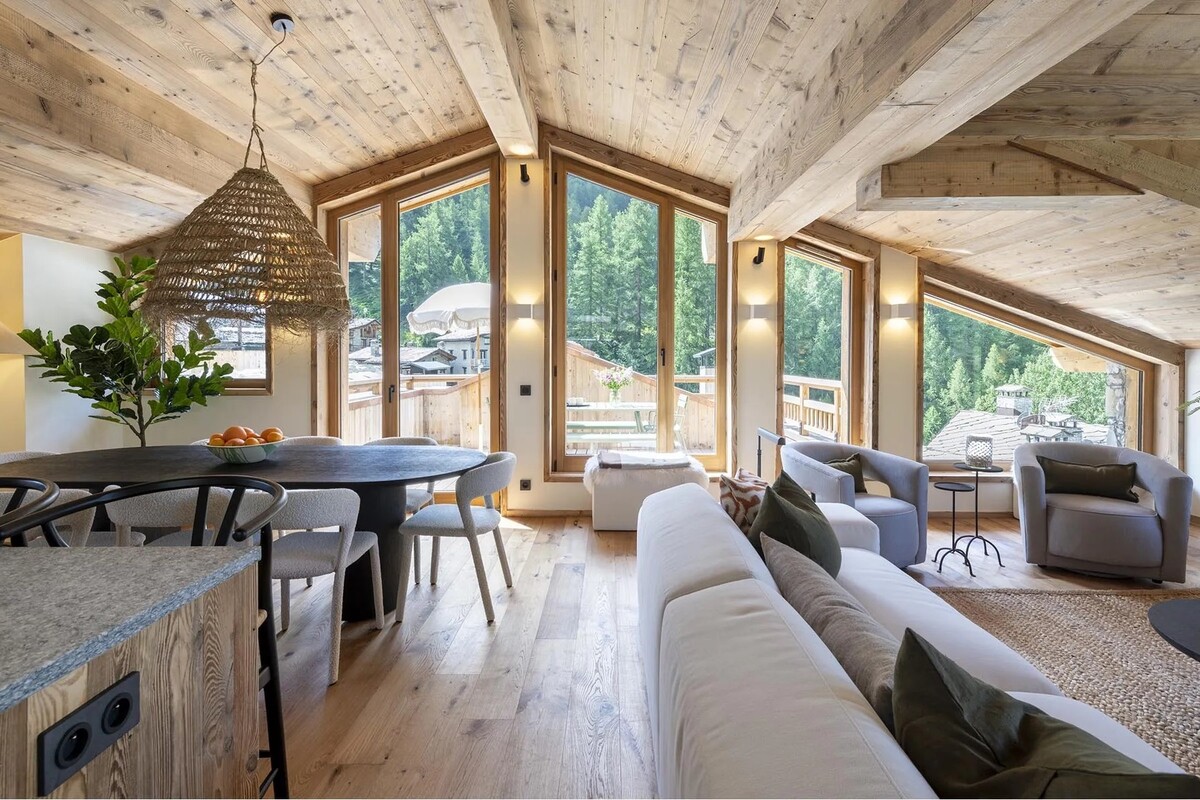 This unique apartment sleeps up to eight guests in four elegantly decorated ensuite bedrooms across 155 square metres, combining contemporary design with the charm of a traditional chalet.