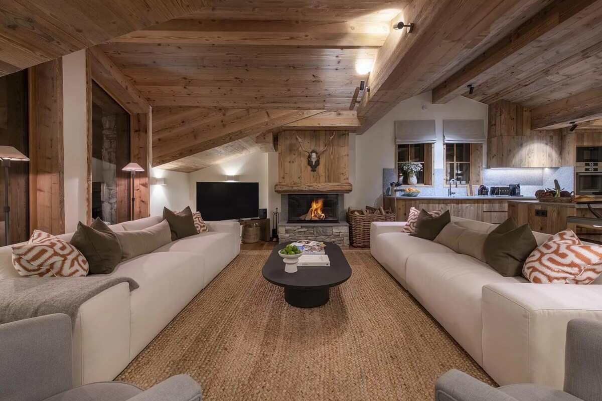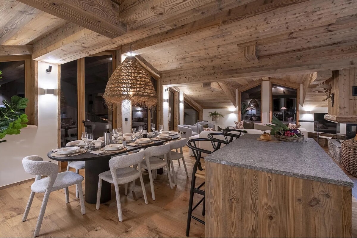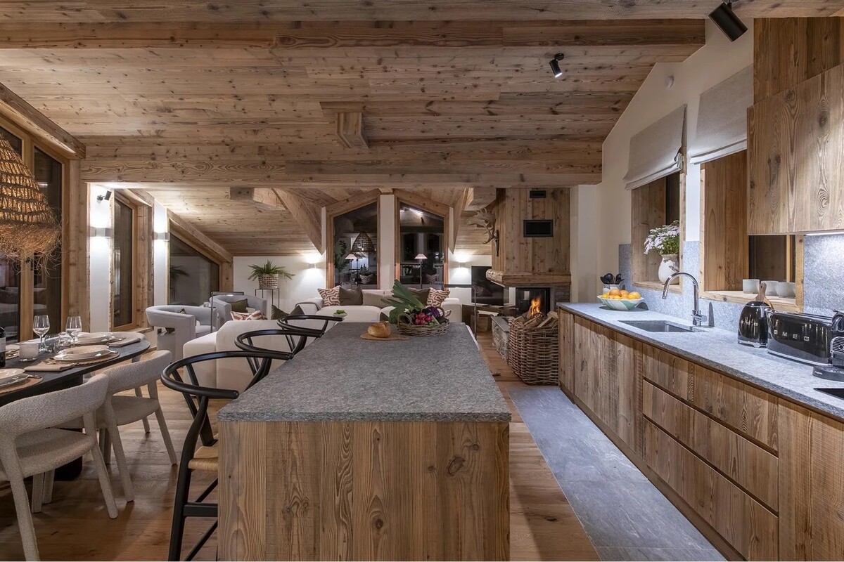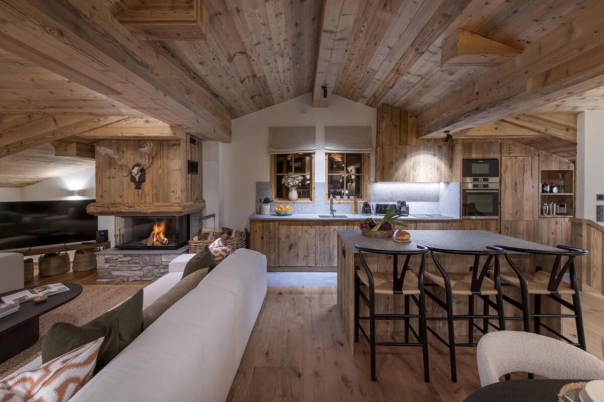 The top floor features an impressive, double-height living area with expansive windows flooding the space with natural light and great mountain views. Here, guests can relax by the wood-burning fireplace, gather in the stylish open-plan kitchen and dining area crowned by a rustic chandelier, or step out onto the south-facing roof terrace for al fresco dining or quiet mountain stargazing.