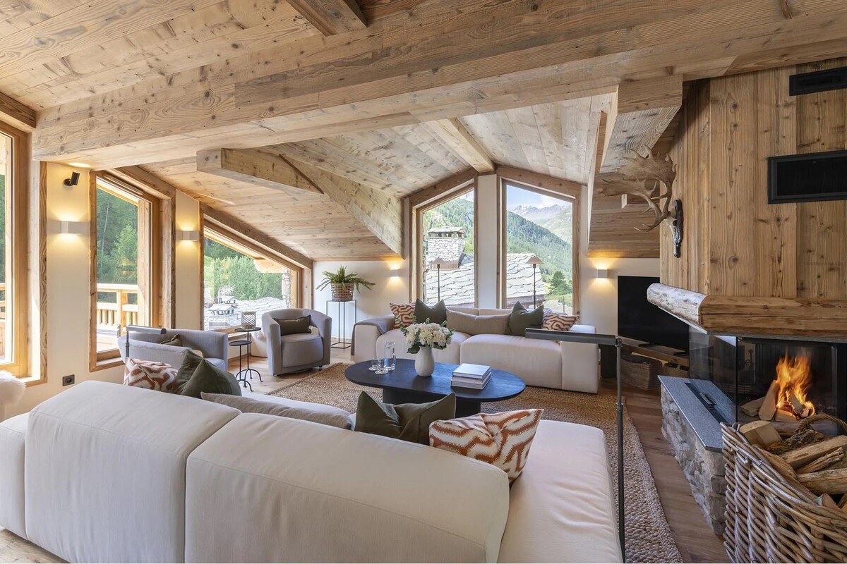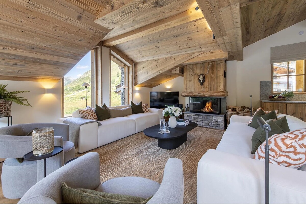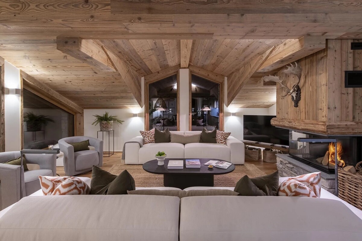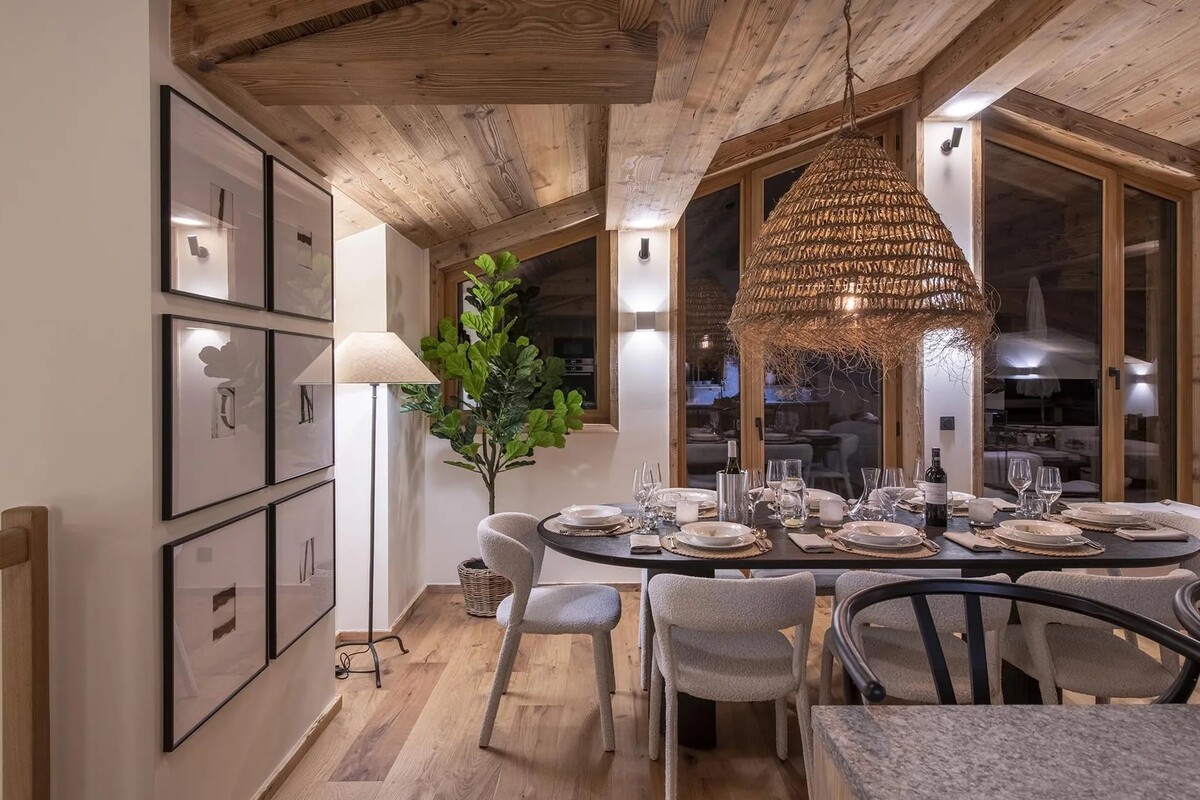 The top floor features an impressive, double-height living area with expansive windows flooding the space with natural light and great mountain views. Here, guests can relax by the wood-burning fireplace, gather in the stylish open-plan kitchen and dining area crowned by a rustic chandelier, or step out onto the south-facing roof terrace for al fresco dining or quiet mountain stargazing.