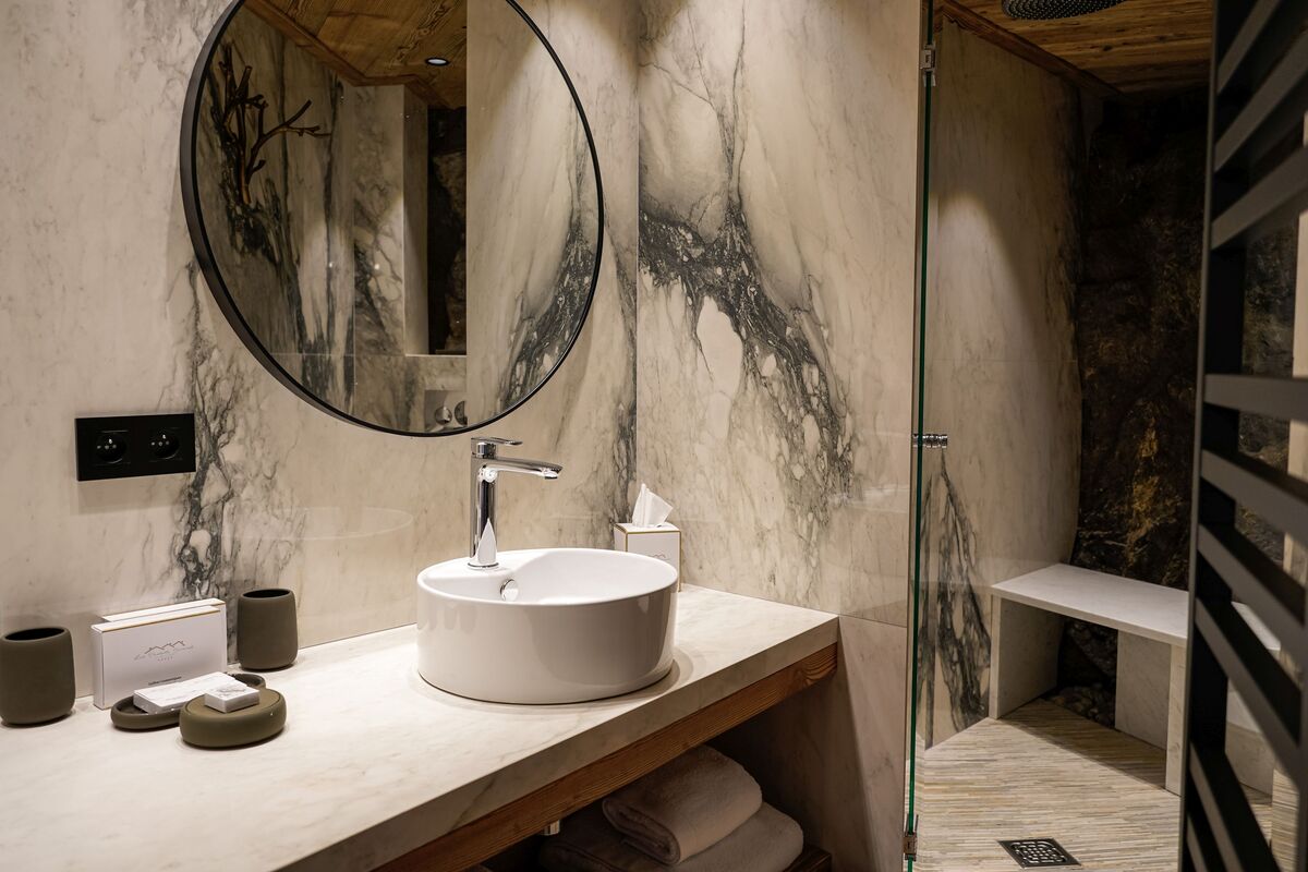 The Chalet Cahokia has taken the use of local raw materials to the max, and even incorporates the living mountainside into the architectural form. In the upper floor sitting room large windows on three sides of the room allow sparkling mountain light to flood the space, and the stone walls and wooden floors compliment the natural surroundings. The modern bathrooms are all clad in the highest quality marble effect porcelain tiles and exude luxury.