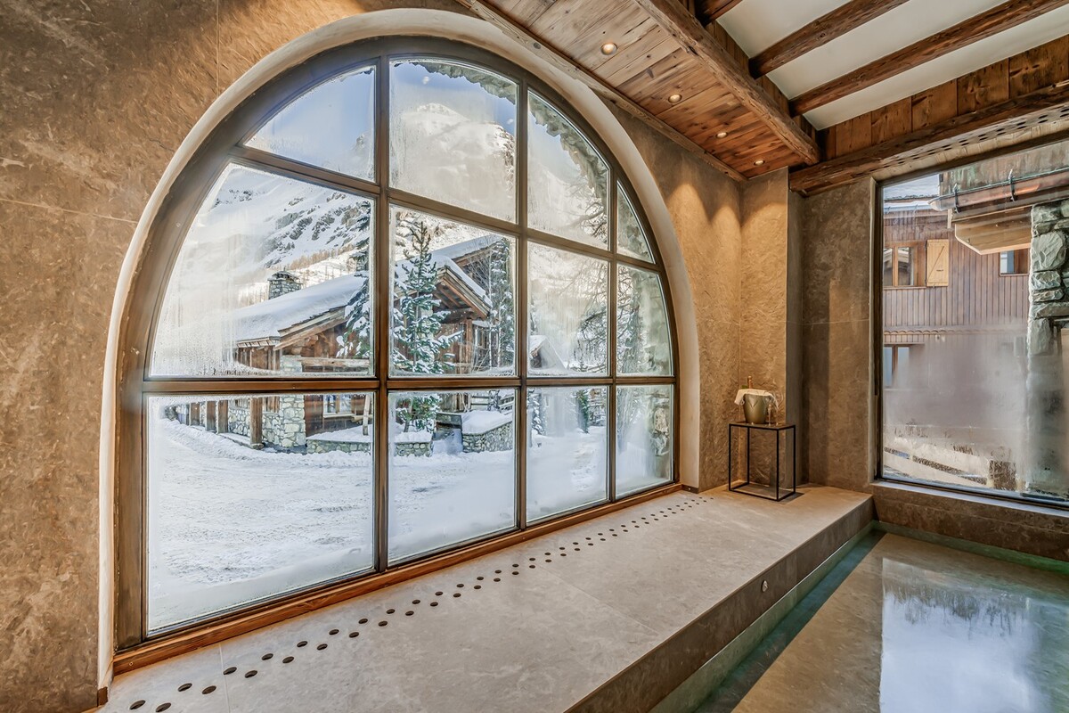 The luxury Chalet Le Rocher in Val d'Isere is located at the top of an exclusive road which guarantees privacy and makes full advantage of great views down over the village and the Isere valley. As you approach the chalet you are greeted by heated steps leading to an intricately carved door from Afghanistan. Le Rocher perfectly balances the combination of classic grand authenticity with cutting edge modern style and technology.