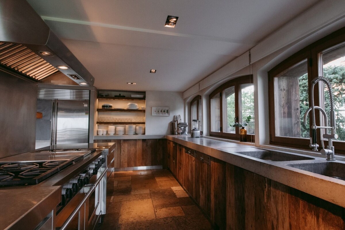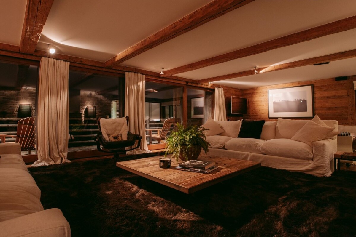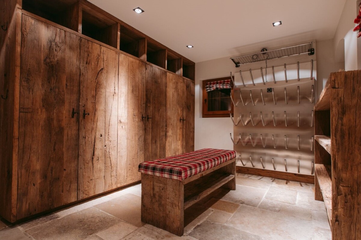 The main entrance of the chalet is on the 2nd floor leading into the main entertaining areas of the house. A sophisticated open plan dining area (seating 14) catered from the well-equipped and extensive kitchen and an elegant living room with open fireplace. A separate winter entrance leads to the ski room and a guest toilet.