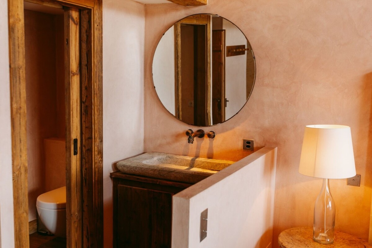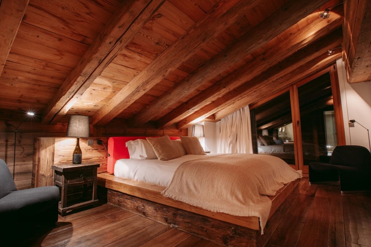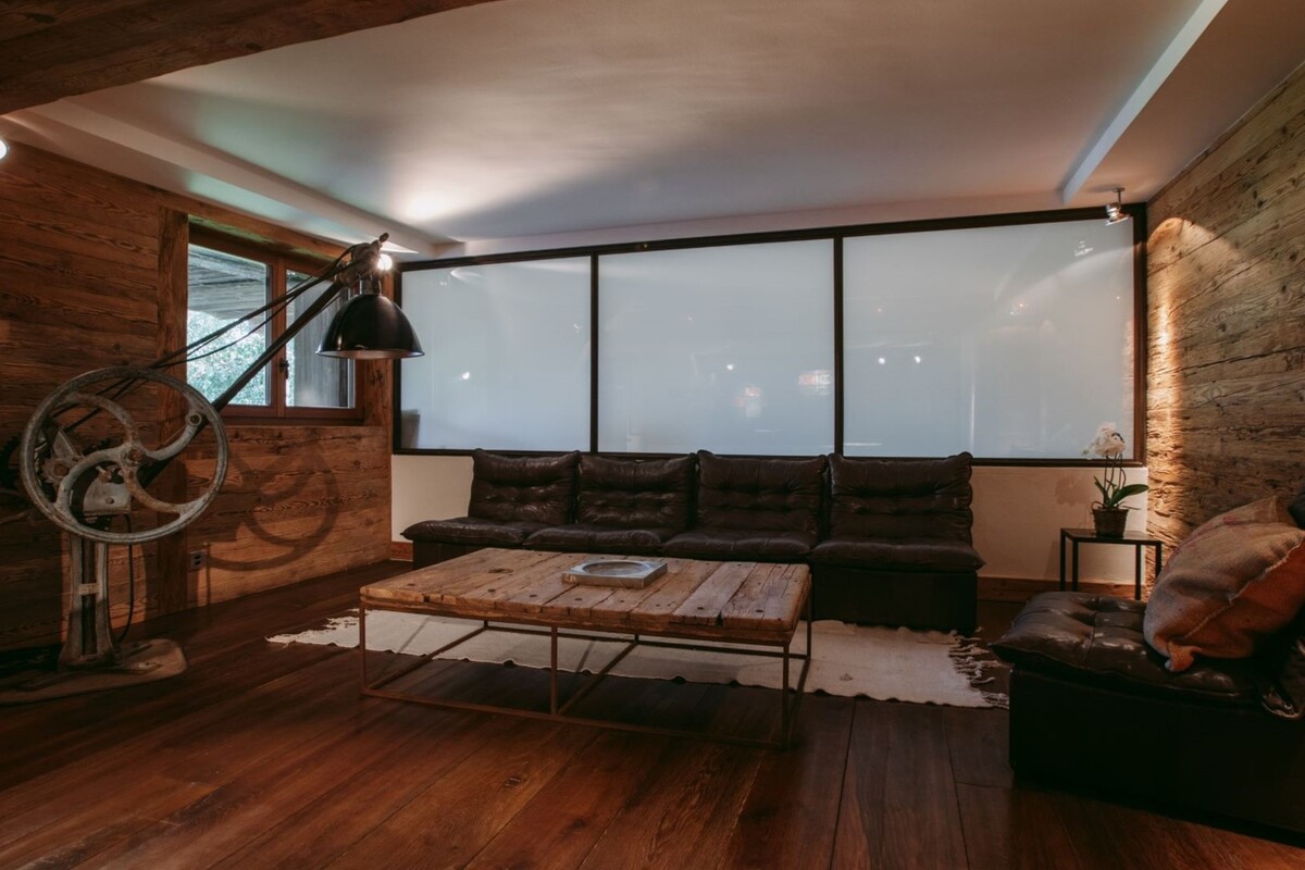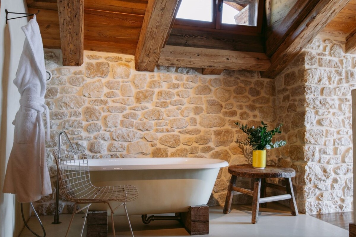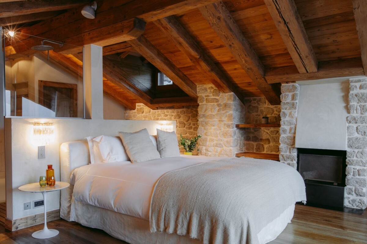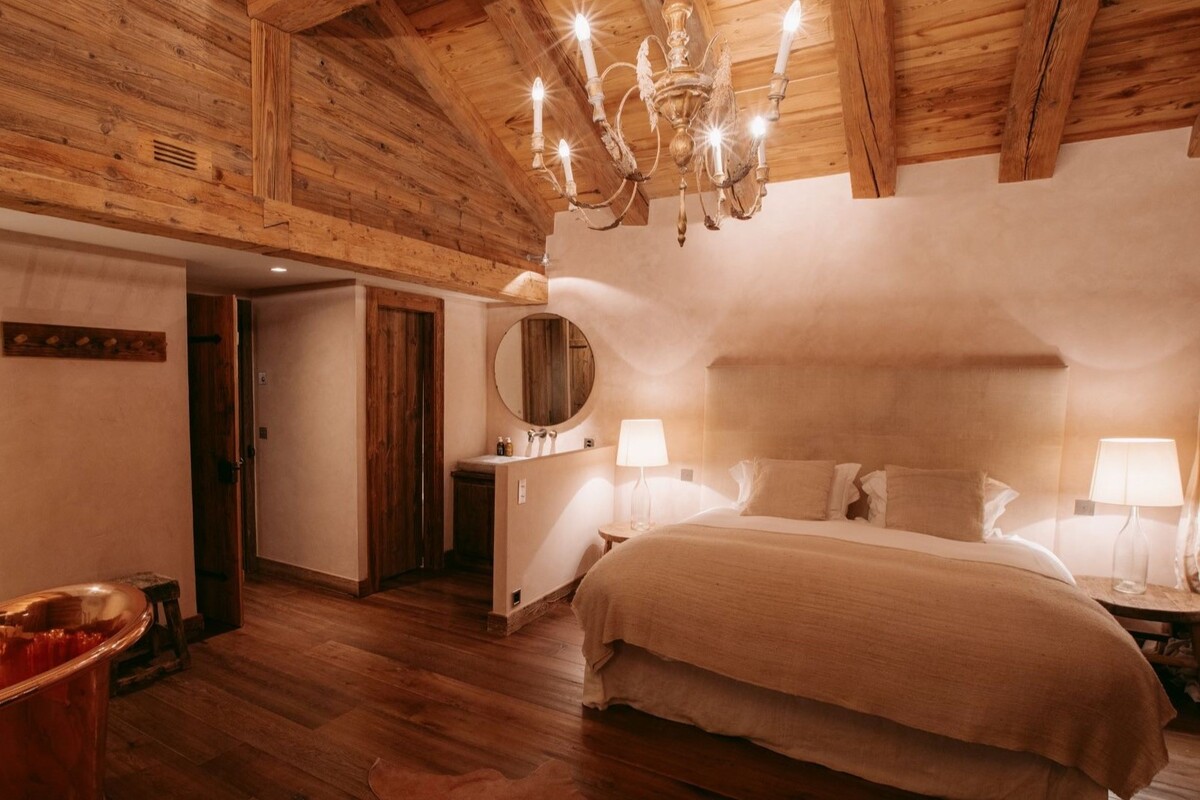 Antique wood beams and panelling, oak flooring, natural stone sinks, walls and fireplaces and alpine detailing have been successfully combined with roll top copper baths, contemporary lighting and furniture, pop art, and sumptuous fabrics to create a unique property.