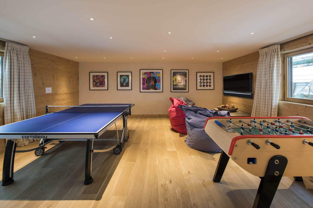 The ground floor is the largest floor of the chalet with an incredible spa area complete with the 15 metre indoor swimming pool, Hammam and relaxation area. Also on this floor is the bar and TV room, wine cellar and cinema room. The ground floor contains four of the nine bedrooms including the quad bunk room.