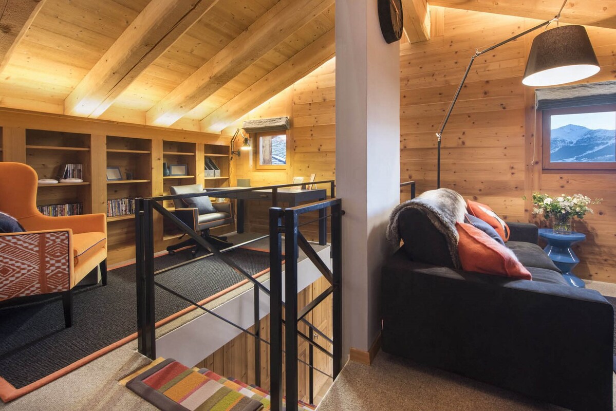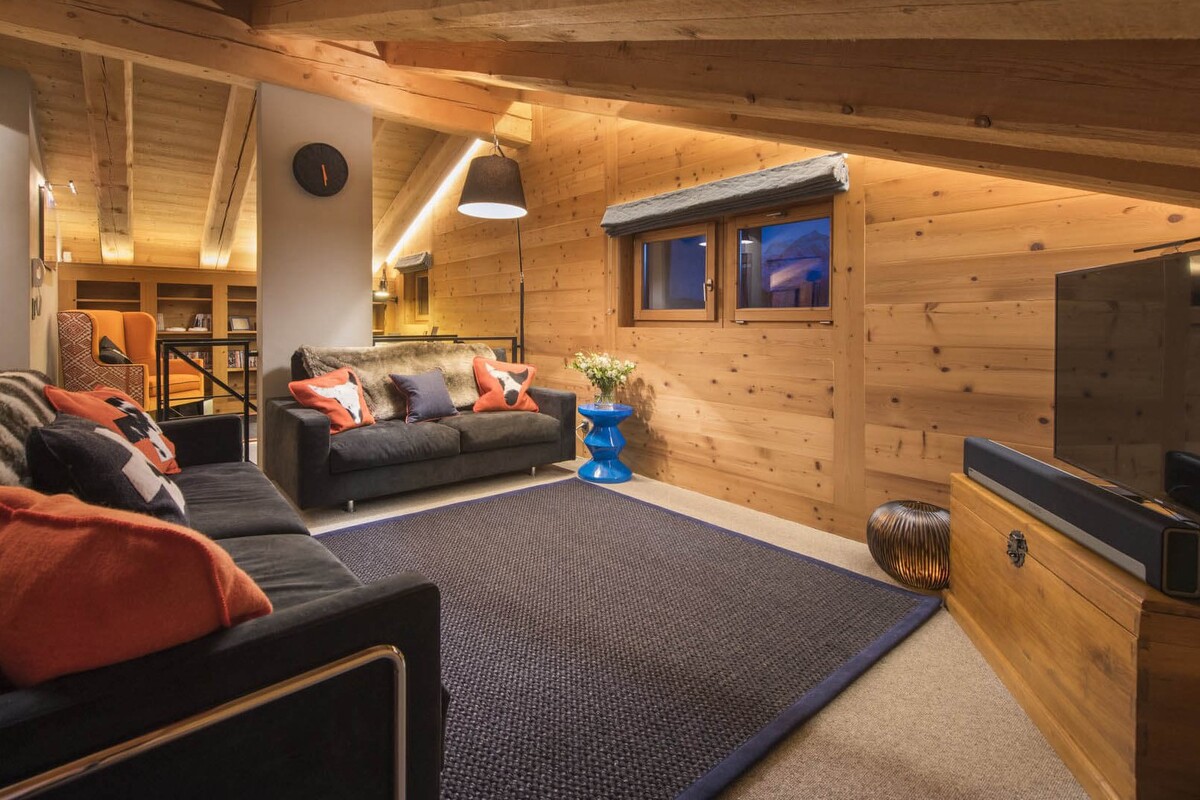 The sitting room of the chalet is wood pannelled and decorated with elegant furnishings. The central stone fireplace is a fantastic centre point for the room and the French windows open up onto a balcony that has stunning views of Verbier and the mountains beyond. Two of the four bedrooms are on this floor.