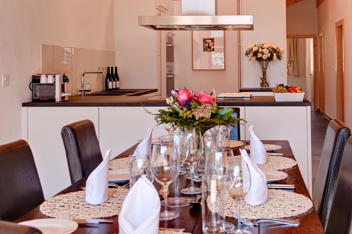 Chalet Zeus combines modern features with a traditional alpine feel. The high sloping ceilings in the living area give an open fell and the full floor to ceiling windows make full use of the fantastic views. The Kitchen is very well equipped with all the modern appliances you could need, this leads on to the open plan dining area with a wood burning fireplace and living room with comfy sofas. All these spaces give onto a wide south-facing balcony with unmatched views of Zermatt.