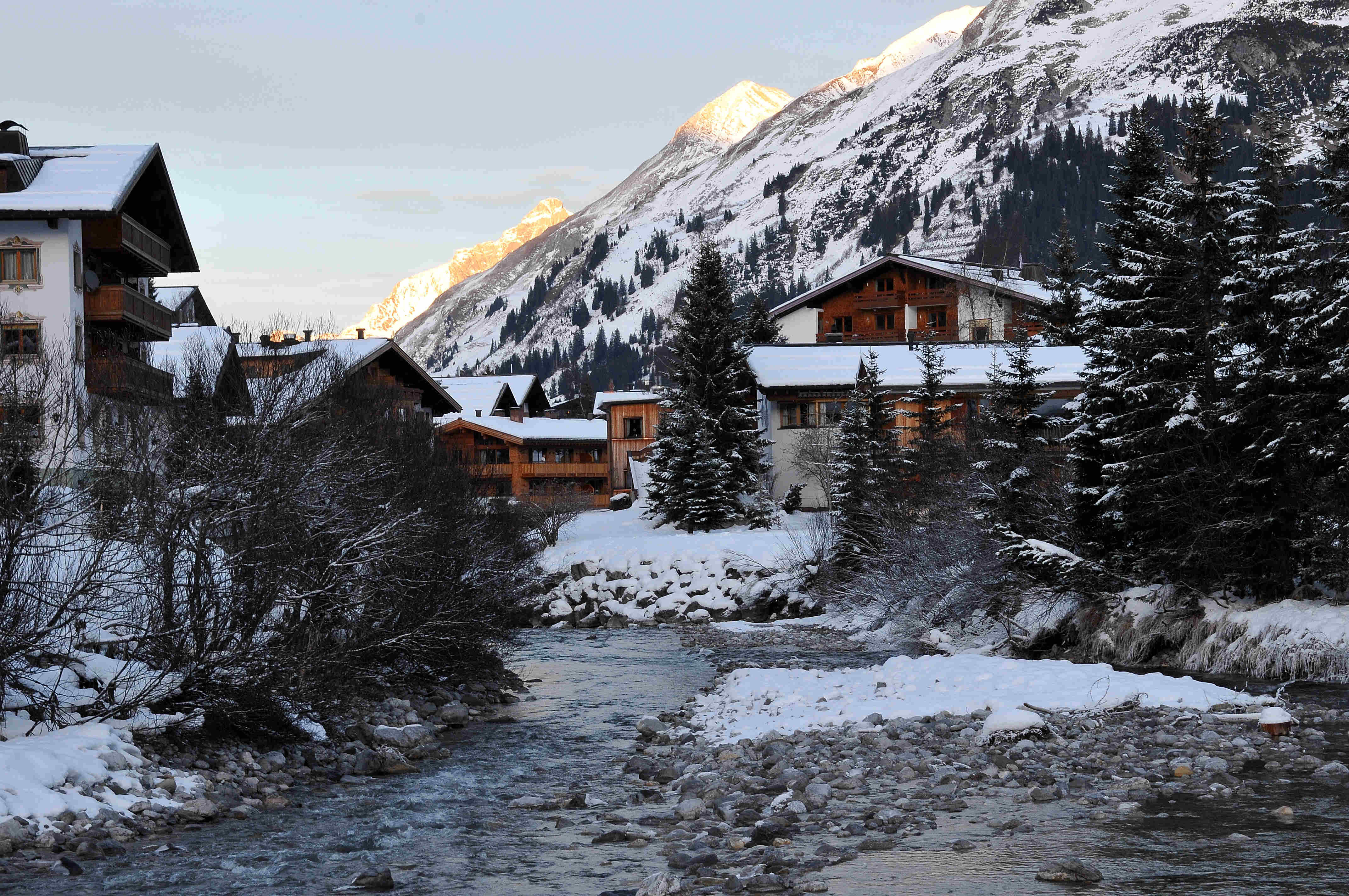 Lech has enormous charm – it is everything you could want from an alpine resort including horse-drawn sleighs. The resort is spread out along the pretty river that winds its way along the broad valley floor. There are no serious hills to walk up or down unlike in St Anton, Verbier, Courchevel or Meribel and there is plenty of sunlight that reaches the resort level even in December, unlike Chamonix and Zermatt. So it’s easy to get around Lech and when the sun comes out it looks as charming as any alpine resort. There are no high-rise, ugly apartment blocks (as in Val d’Isere, Tignes or Les Arcs) and all the chalets and hotels in Lech are traditional in character. With flat ground and the wide walkways that follow both the river and the superb shopping, walking is how one gets about which makes the pace of the resort unhurried and stress free. An easy 3-4 minute stroll from your hotel or chalet to the ski school meeting point or lifts is so much more appealing than cramming onto a packed resort shuttle bus – those who know Val d’Isere and Verbier know what we mean.