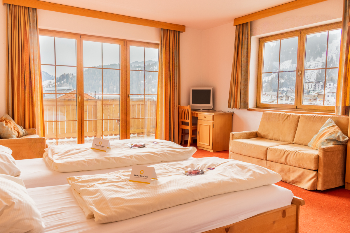 The chalet has 11 Austrian twin rooms with en-suite shower and wc that each have a 3rd single sofa bed. There is a 12th guest bedroom which is just for two people. You can therefore fill the chalet with 24 guests but there are no less than 11 extra beds to allow a group of 35 guests to take the property.