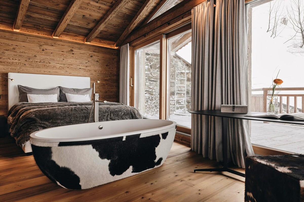 Hahnenkamm Master Suite (72sqm) offers a double bed area with open claw foot bath; a sitting room area with sofa bed, fireplace, desk area, flat screen TV, Sonos sound system, shower room and large terrace.