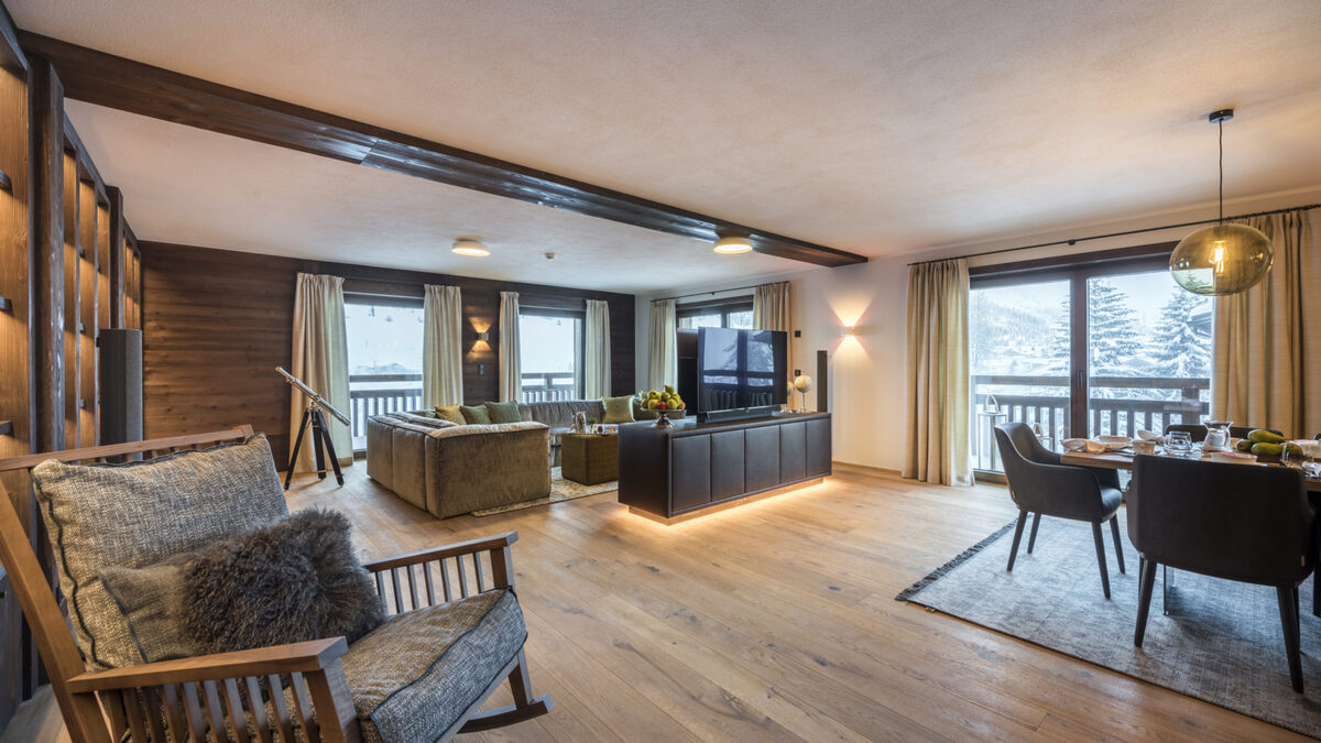 At the heart of the Nidus 3 apartment is the open plan living and dining area which has more than enough space for all guests. One half of the main living area is given to a dining table, the other half is filled with large inviting sofas, wonderful for relaxing and curling up by the modern fire place. Every window in the living area frames beautiful views of Lech. Perfect for watching the sun set over the mountains.
