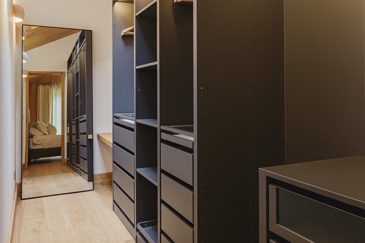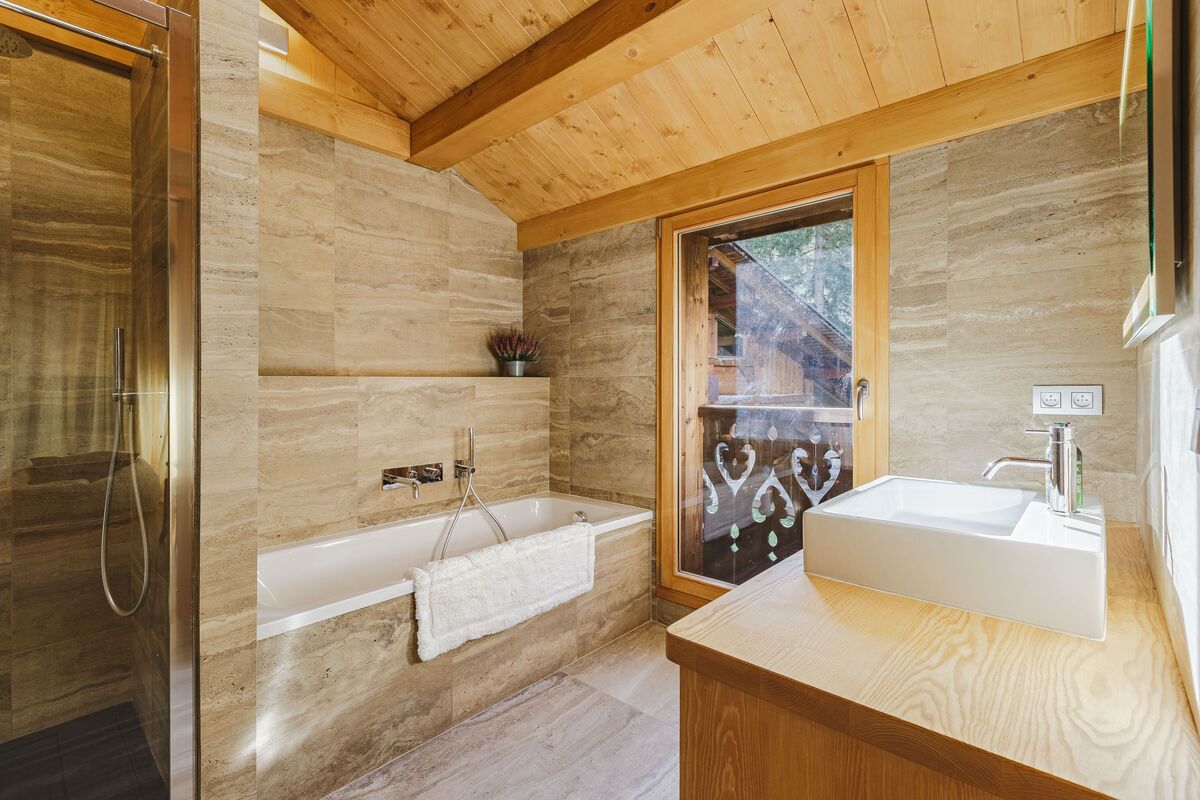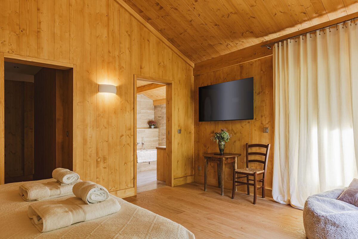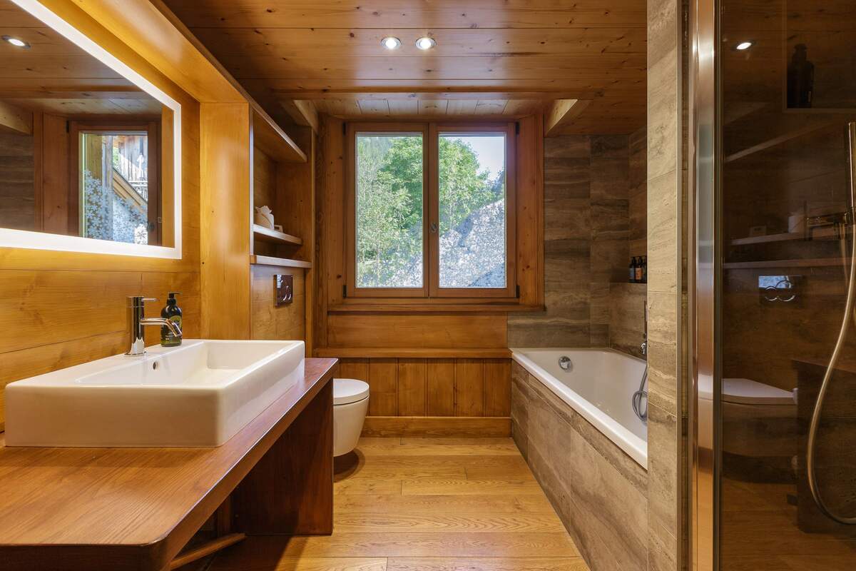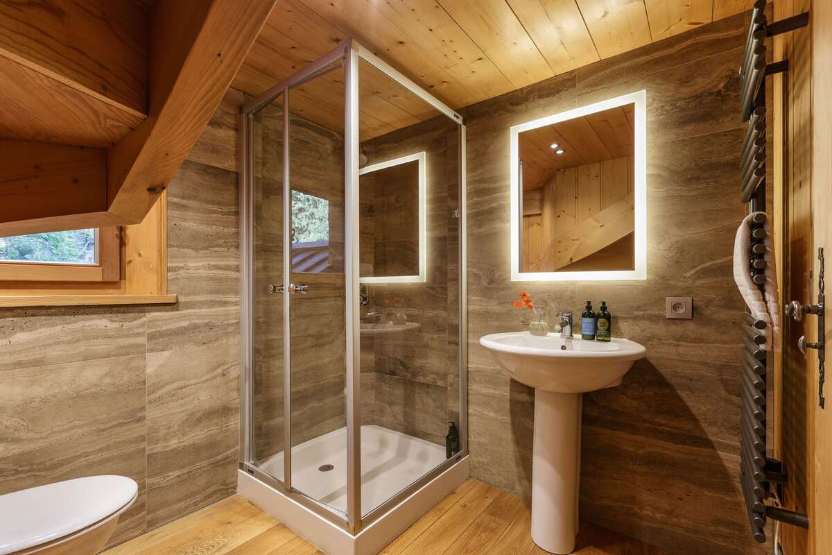 On the ground floor of the chalet is the large entrance hall and ski & boot room. Also on this floor is a new master double bedroom with dressing area and en-suite shower room. The living area is open plan with well equipped kitchen, dining and sitting area. The high quality kitchen has a beautiful range cooker, breakfast bar, granite worktops, dishwasher, microwave and large fridge with a small freezer unit. There are also full laundry facilities with a washing machine and tumbledryer in the spacious basement area. The living/dining area is perfectly suited for relaxing in comfortable armchairs and sofa around the large open fireplace. With large windows looking out towards Mont Blanc guests can enjoy magical sunsets (especially later in the season during March and April).