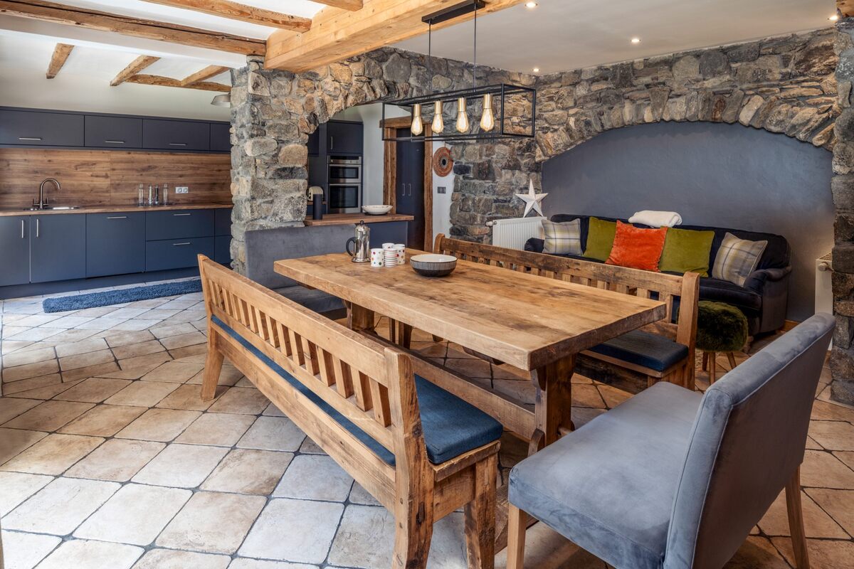 This is a self-catered property, which boasts a large, well-equipped kitchen and dining room arranged around original stone walls.