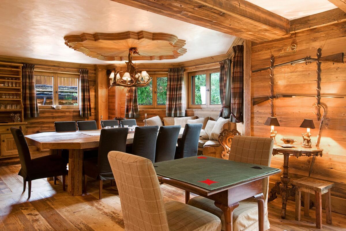 On the second floor there is a lovely large sitting room, the heart of this luxury chalet, with large open fireplace. With the wood panelling on the walls, the wooden beams and (you guessed it) the wooden floor this room feels every inch the living room of an alpine chalet. Set amongst trees this chalet really does reflect the local Savoyard architectural traditions and as a result it creates a wonderful atmosphere for its guests. The dining area (also on the 2nd floor) seats 16 guests - the perfect place to catch up with friends and family whilst enjoying a delicious dinner.