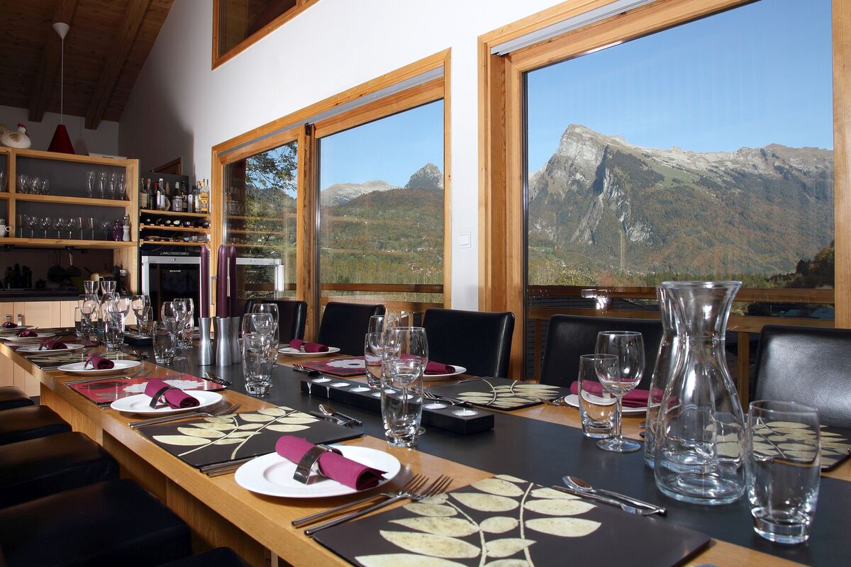 Chalet Brio is the centerpiece, featuring 6 spacious ensuite bedrooms, each designed with privacy and style in mind. The expansive living spaces are warmed by a log-burning fire, complemented by underfloor heating throughout. The large dining room, with its panoramic views of the surrounding mountains, is the perfect setting for a delicious, fully catered experience. Guests are treated to a hot breakfast each morning and a 4-course evening meal, complemented by unlimited, carefully selected bottled wine matched to the meal each night, served 6 out of 7 nights. For relaxation, Chalet Brio offers a private outdoor hot tub, sauna, home gym, pool room, and a climbing room, ensuring there's something for everyone to enjoy.