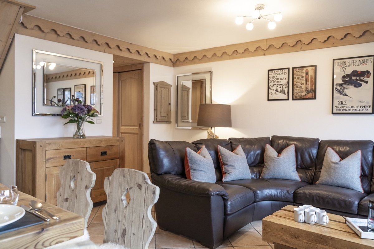 Apartment 320 Les Fermes has glorious views from the living room, the master bedroom and one of the twin bedrooms. The apartment has a lovely open plan kitchen, living, dining room with a big oak beam work surface. The dining table comfortably seats guests and is the perfect setting for a group of friends or a couple of families to enjoy lovely home-cooked meals (pre-cooked meal deliveries can also be arranged if you prefer). The big comfortable sofas are perfect for resting tired legs after a day's skiing and there is also the Residence's shared spa with swimming pool and sauna.