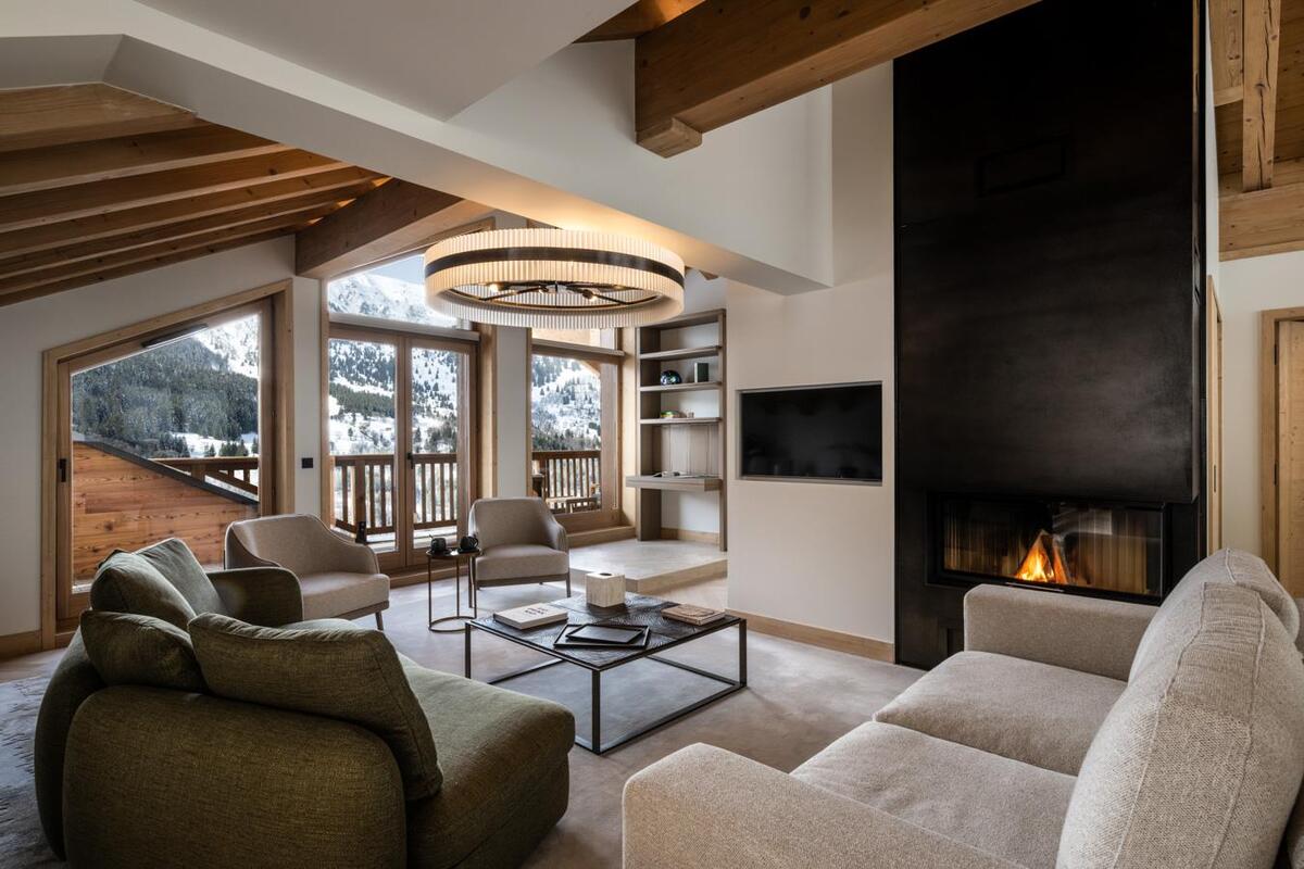 One of the chic Falcon Lodge apartments in Meribel (opened December 2023). Lovely views and stylish decor.