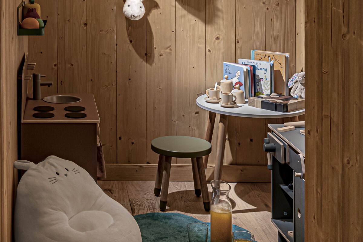 The lower floor is dedicated to guest well-being with a 6-metre indoor swimming pool, sauna, steam room, treatment/massage room and relaxation area. Each of the next two floors has two bedrooms and the top floor of the chalet is dedicated to a living space with kitchen, dining and sitting room as well as a separate children's playroom and TV room.