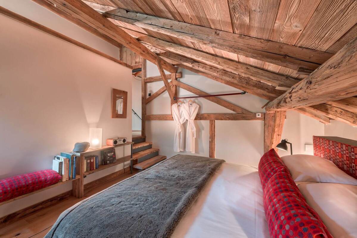 Central to the living area is a stunning glass staircase leading to the upper bedroom floor. Two bedrooms and a master suite are located on the top level of the chalet and all offer en-suite facilities. The master bedroom suite has a large king sized bed and looks out over the living area, taking advantage of the glass fronted wall and valley views. The bathroom has a beautiful free-standing bath from which these views can also be enjoyed.