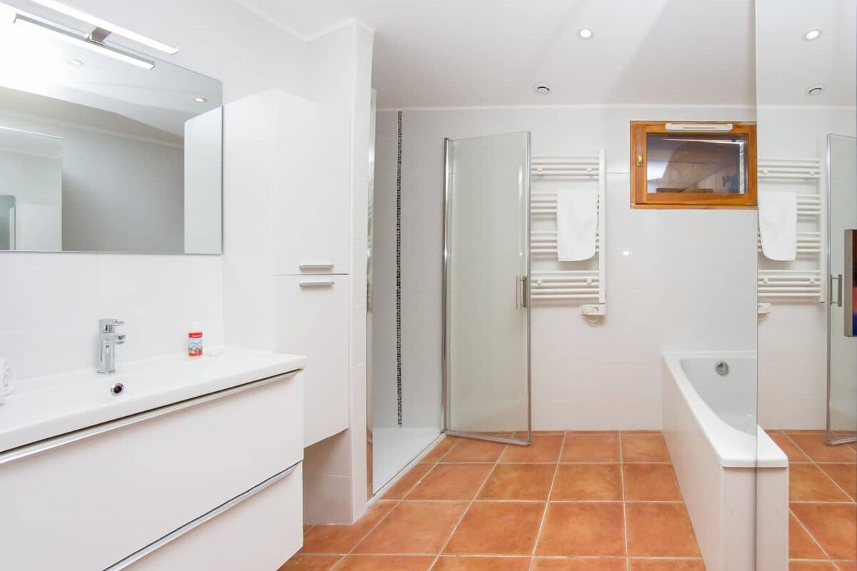 - Suite: double + sofa bed. En-suite shower & bath. Separate wc