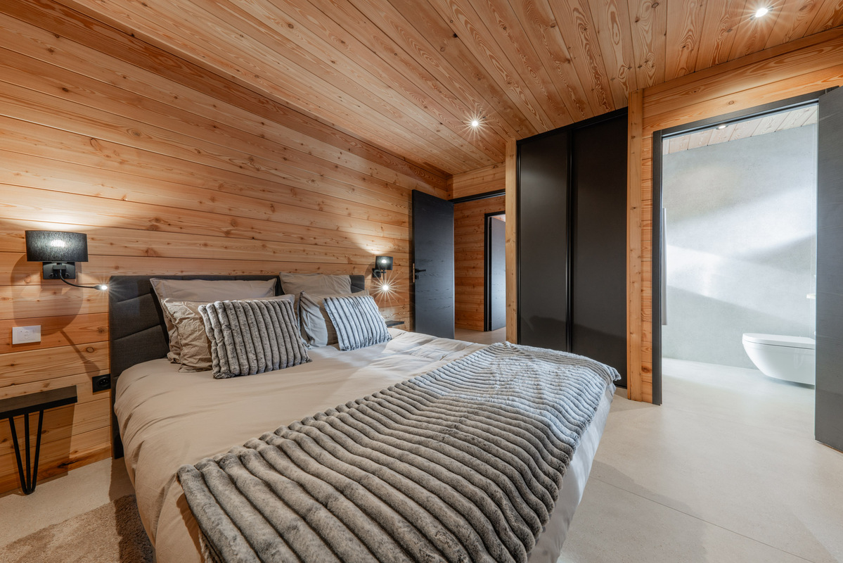 The chalet is laid out across three levels. The garden level houses three elegant double bedrooms, each with its own ensuite shower room, and a room with two bunk beds and a private bathroom. The ground floor offers a boot room, a fully equipped kitchen, a spacious lounge and dining area with a fireplace, and access to the terrace and outdoor hot tub. The mezzanine hosts the pool table.