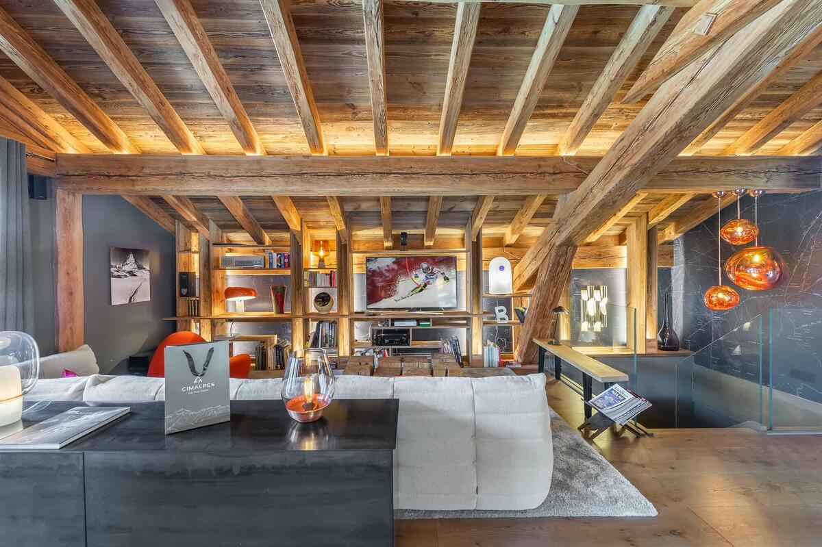 The large open plan kitchen, dining and living room takes up the entire 3rd floor and is organised around a central fireplace. The decor combines the time-honoured local materials of larch and slate with contemporary materials such as Corian, steel and glass to strike a balance between tradition and modernity.