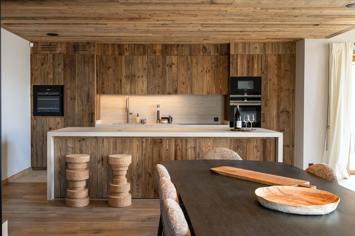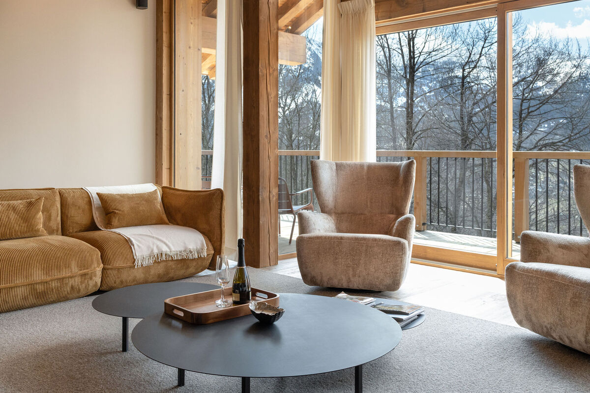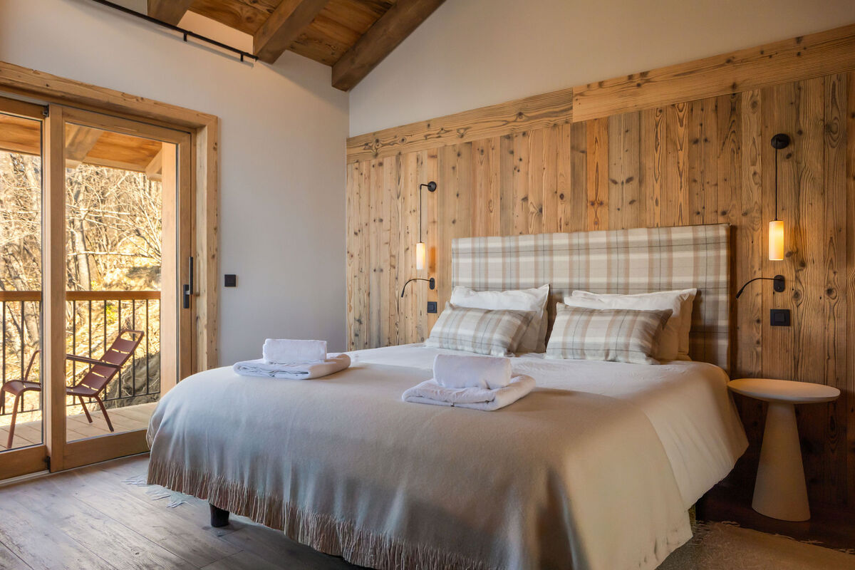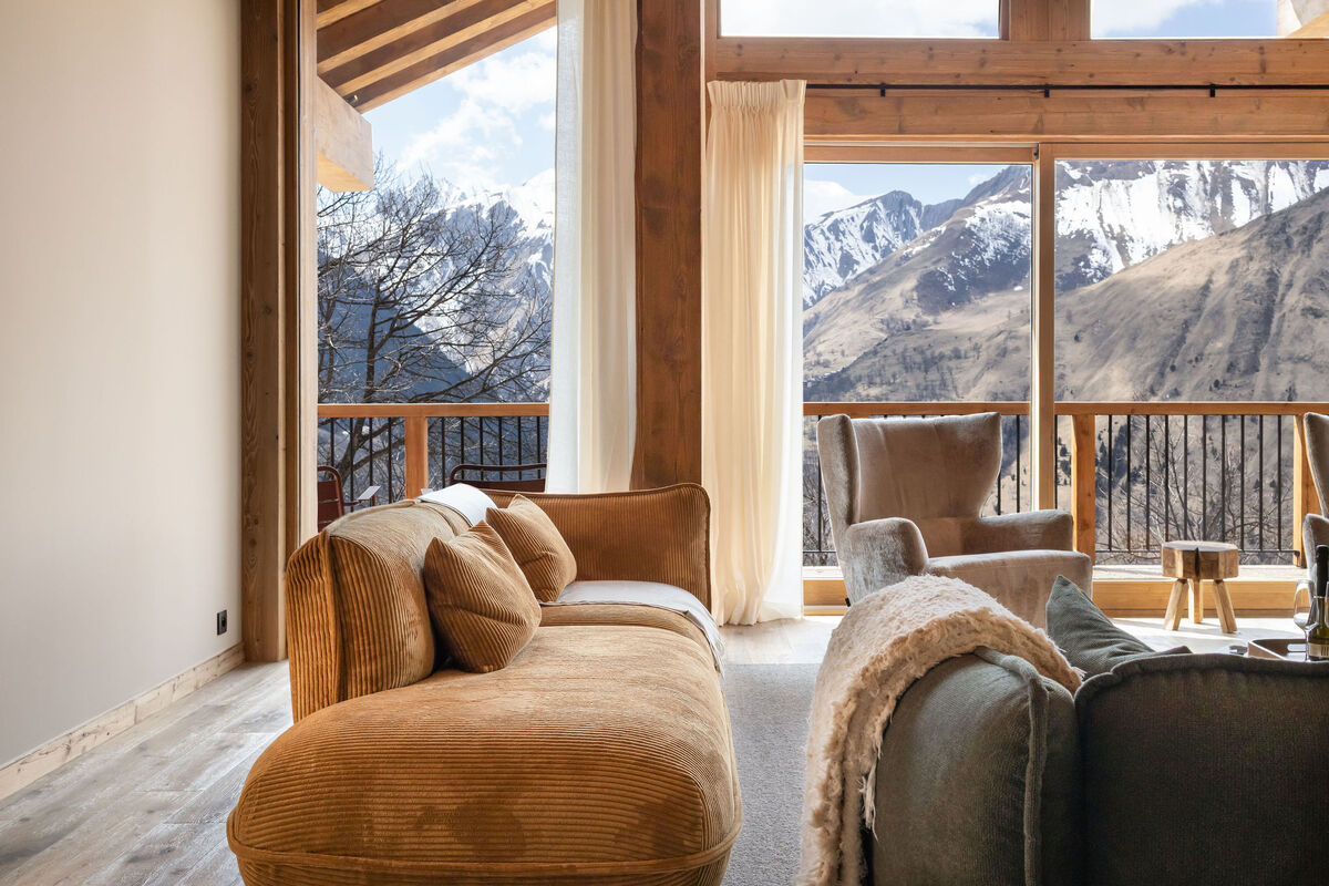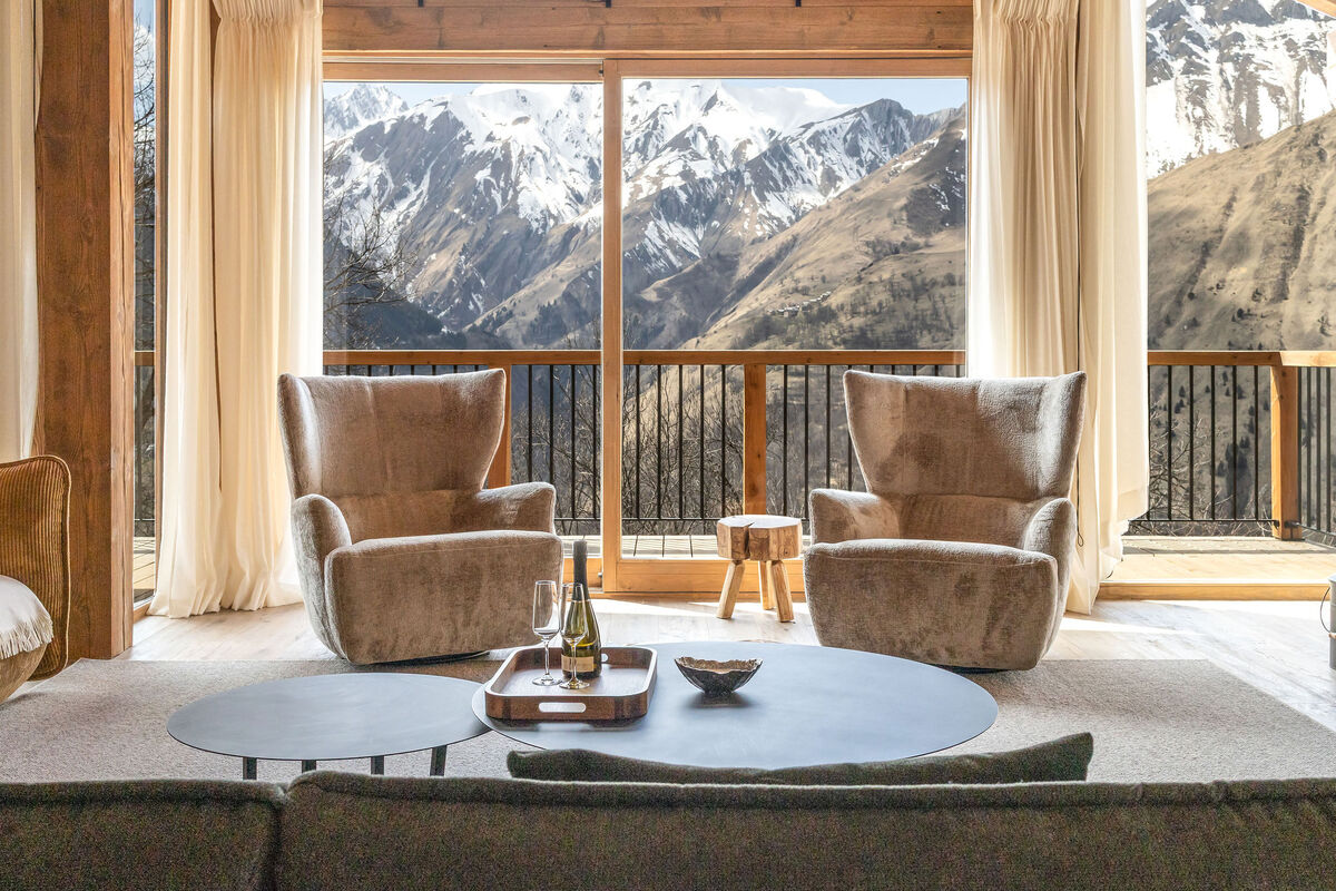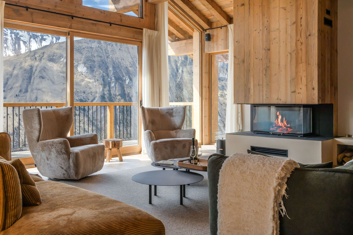Designed to the highest standards, it sleeps up to 14 guests, with a vaulted-ceiling lounge, three-sided fireplace, and panoramic mountain views from floor-to-ceiling windows and balconies. The chalet features a wellness centre with a private Nordic spa, sauna, and gym, along with a cinema room, play area or office space, and a large boot room.