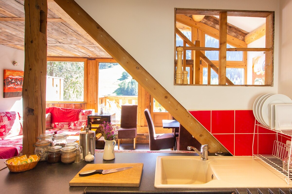Chalet Hattiers Large Apartment is the larger of two chalet style apartments. Located towards the edge of Tignes Les Brevieres village the apartment has stunning views of the village and the mountains. It is only a three minute walk to the village centre meaning easy access to the incredible restaurants the village offers. Guests can ski directly from the chalet to the main lifts which are 150 metres away allowing ease of access.