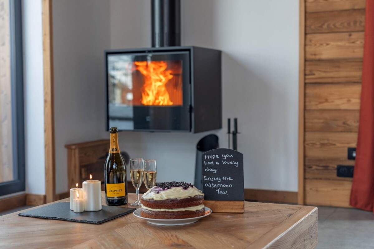 The spacious main communal sitting room and dining area have huge picture windows on 3 sides as well as a welcoming log fireplace. Everything about this chalet property is high quality - from the triple glazed windows to the fixtures, fittings and beds and bed linen.