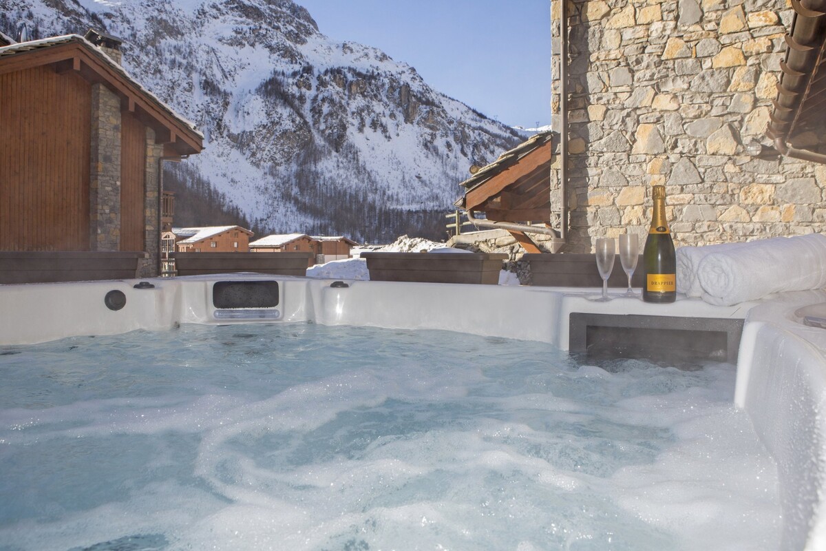 Chalet Grande Casse in Val d'Isere is a great chalet with access to a (shared) hot tub. This property is fairly newly built and the decor is chic and modern. It is on the ground floor of a three-storey chalet. All of the bedrooms are a good size and have en-suite baths and balconies. The lounge and dining areas are spacious and comfortable and really lend themselves to group bookings. The stone fireplace is a great place to gather with a glass of wine and discuss the day's skiing, and with French windows that open onto a large terrace you can enjoy the mountain views well into the evening.