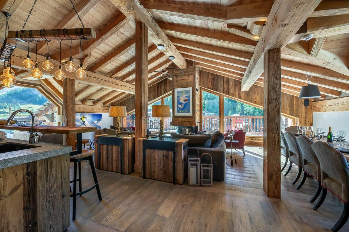 The whole chalet has been furnished in a traditional alpine style with much use of wood panelling and beams as well as a stone open fireplace. The double height main living area on the top floor of the chalet is delightful with deep, comfortable sofas, fabulous mountain views and plenty of space for all guests to relax and socialise together.