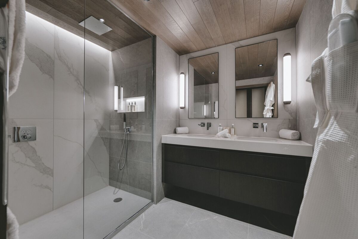 The upstairs living area is most spectacular. The glass-walls provide a real sense of space and allow for panoramic views. The main living area is designed for comfort after a hard day's skiing. The furniture is stylish and has been thoughtfully chosen so that you can relax in luxury. The chalet also boasts its own bar as well as a log fire and flat screen TV and surround-sound system.