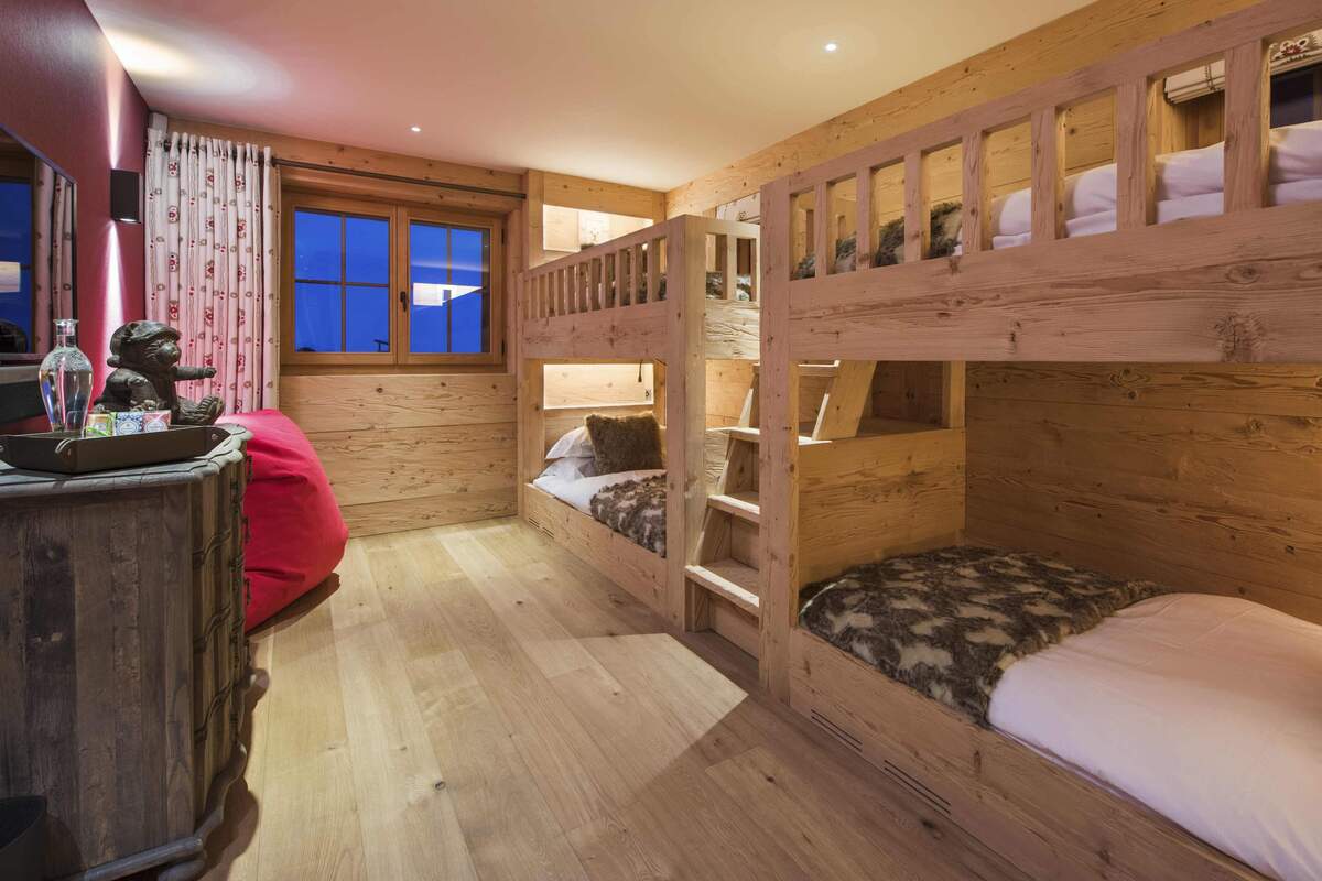 The ground floor is the largest floor of the chalet with an incredible spa area complete with the 15 metre indoor swimming pool, Hammam and relaxation area. Also on this floor is the bar and TV room, wine cellar and cinema room. The ground floor contains four of the nine bedrooms including the quad bunk room.
