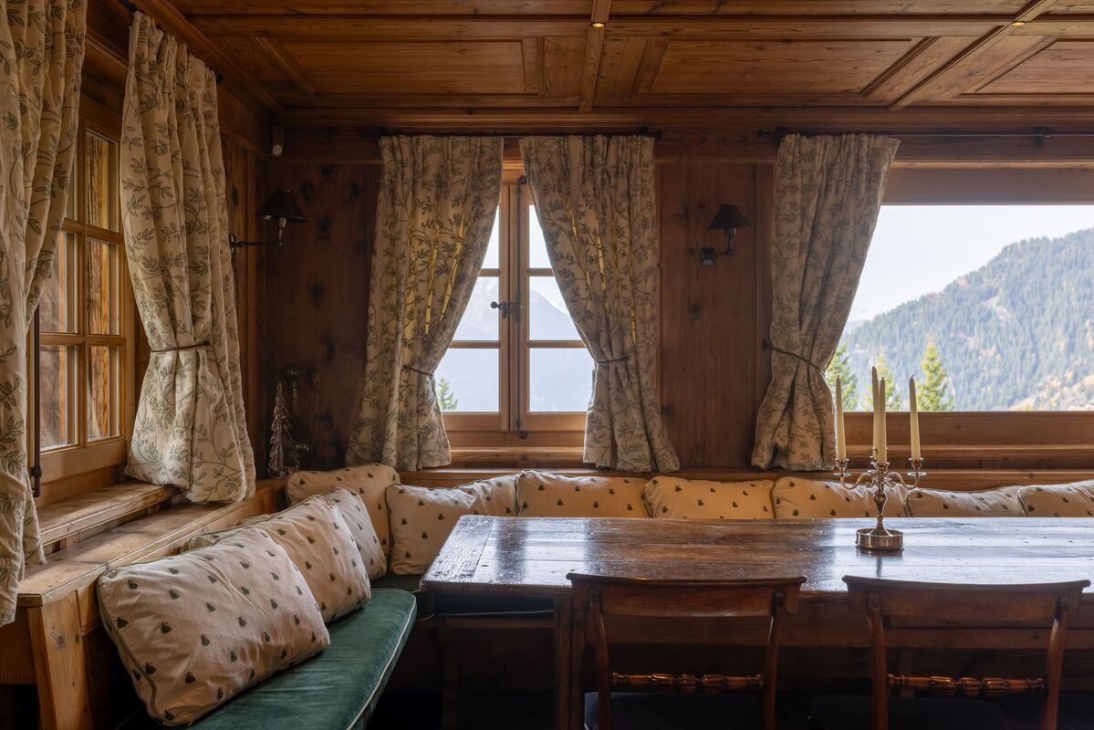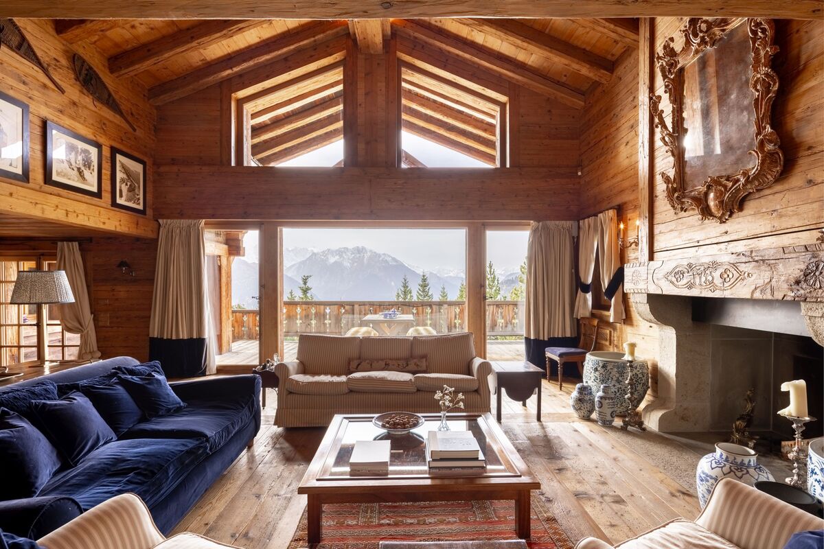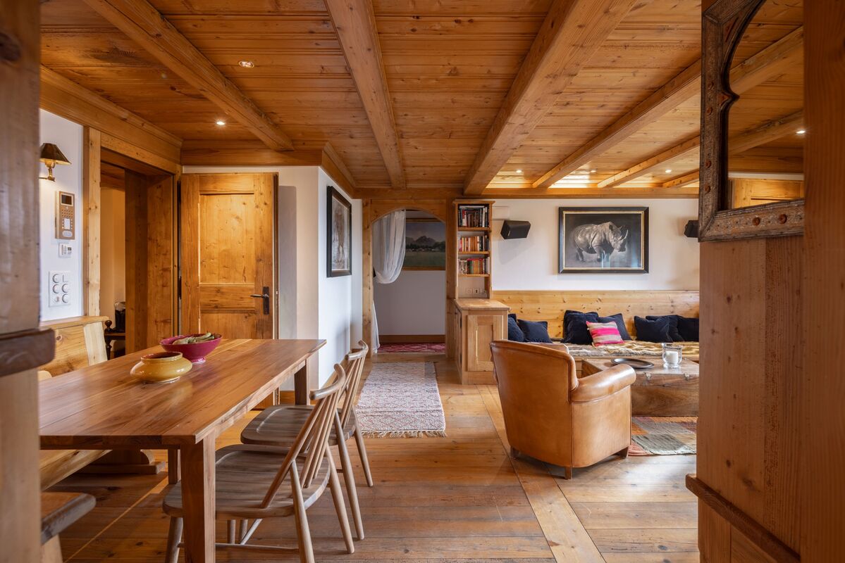 The main sitting room has a traditional fireplace which adds warmth and character, while a mezzanine above serves as a quiet office/work space or a TV snug. From the sitting room there are large doors opening onto a generous south-facing terrace, perfect for sunny days and panoramic alpine views over the resort centre below.