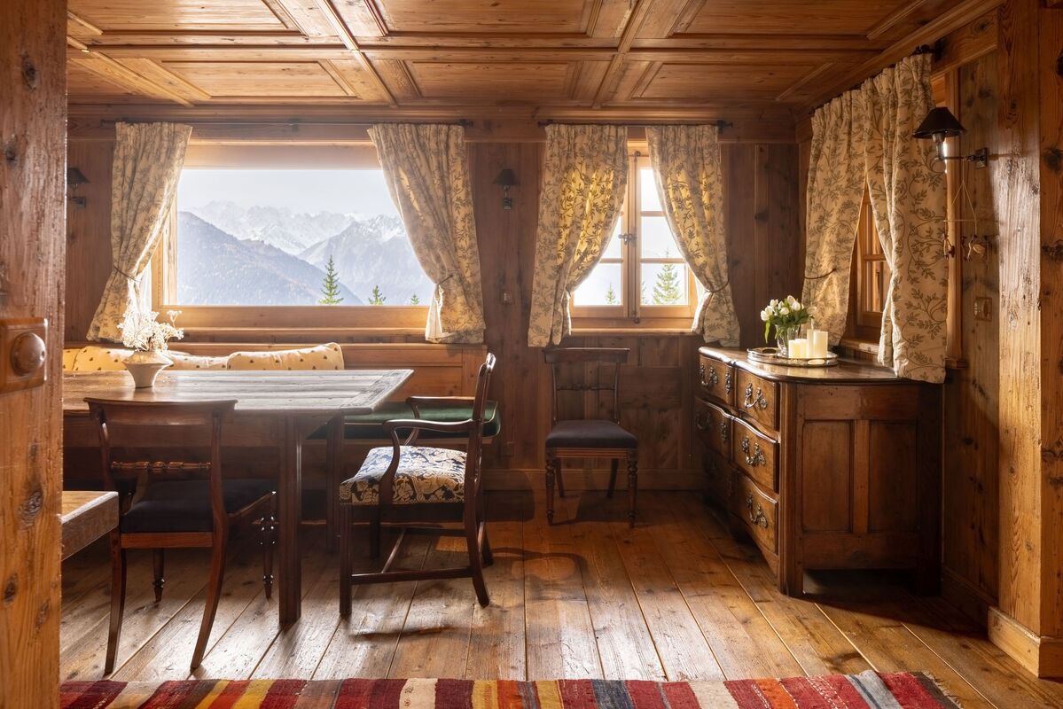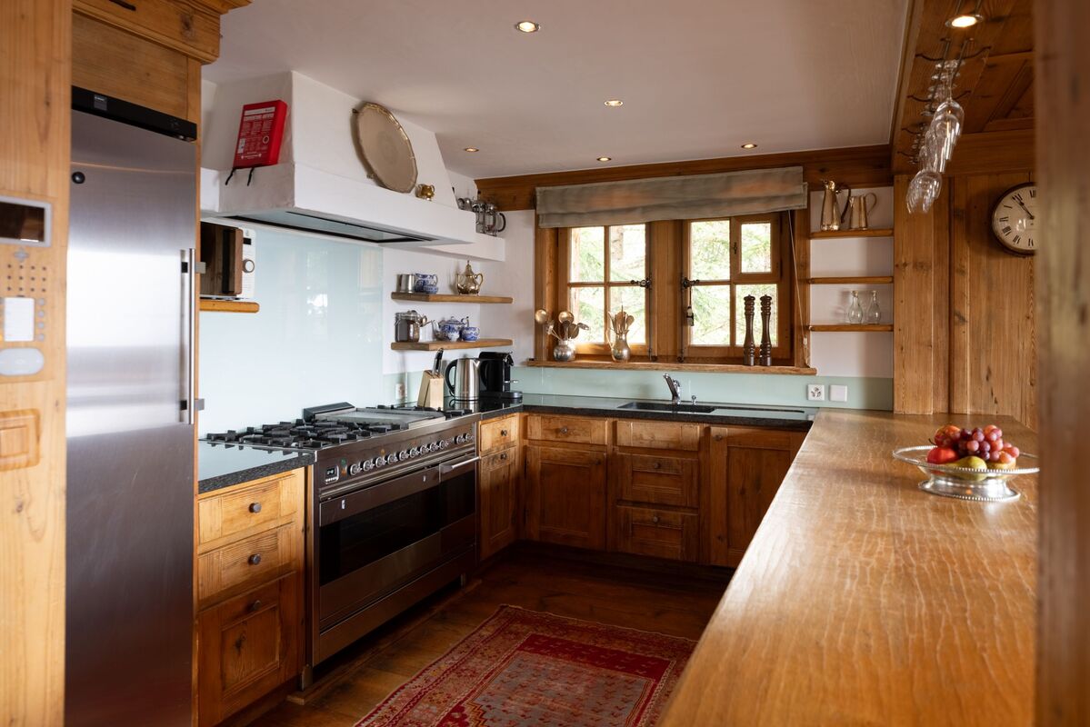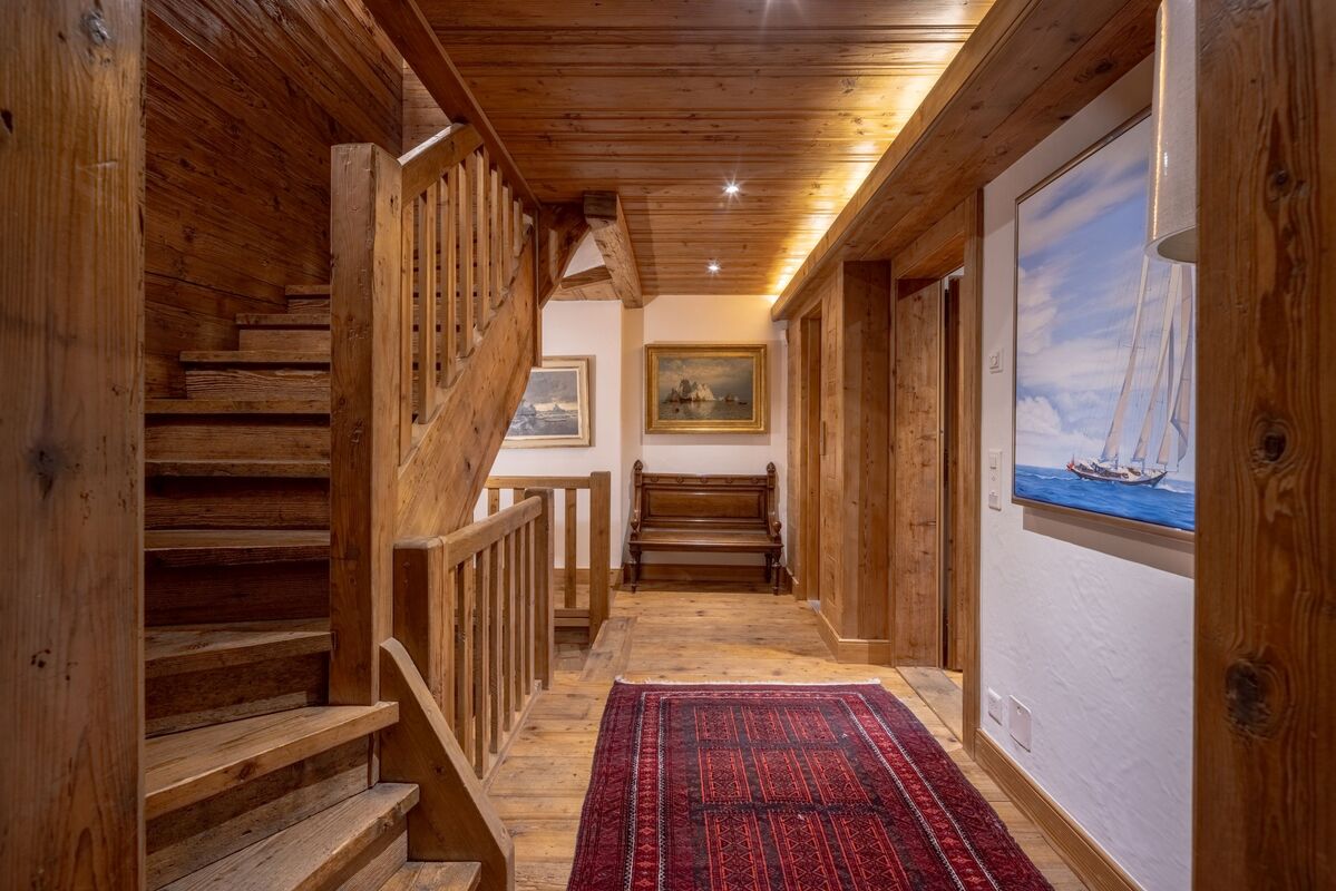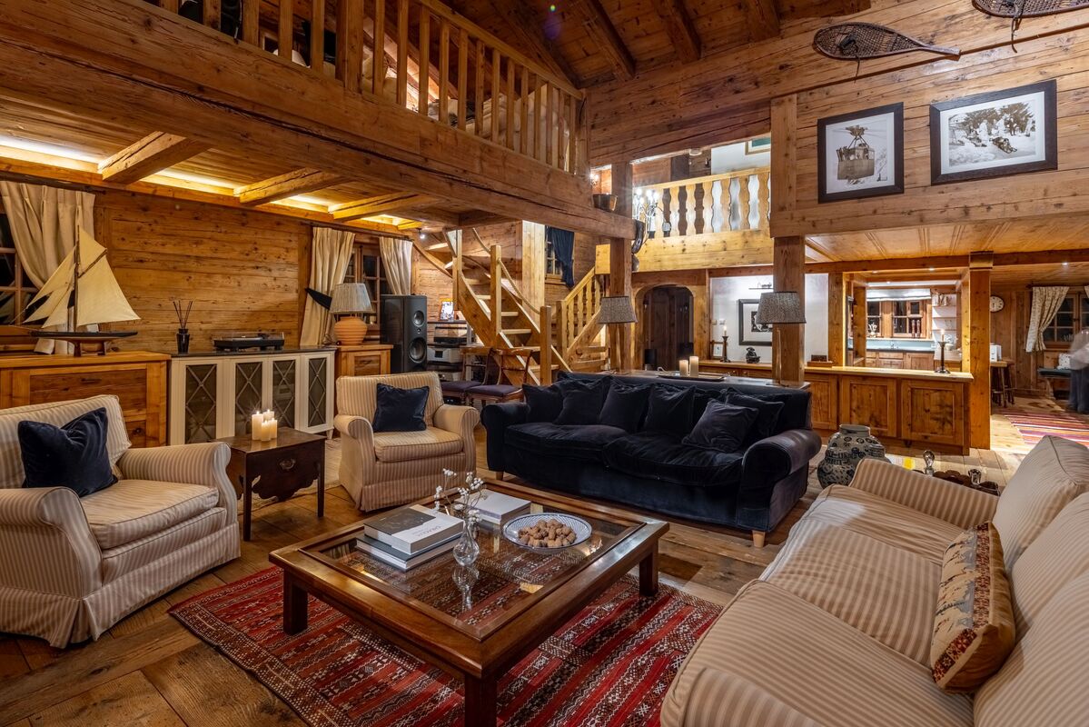 The main sitting room has a traditional fireplace which adds warmth and character, while a mezzanine above serves as a quiet office/work space or a TV snug. From the sitting room there are large doors opening onto a generous south-facing terrace, perfect for sunny days and panoramic alpine views over the resort centre below.