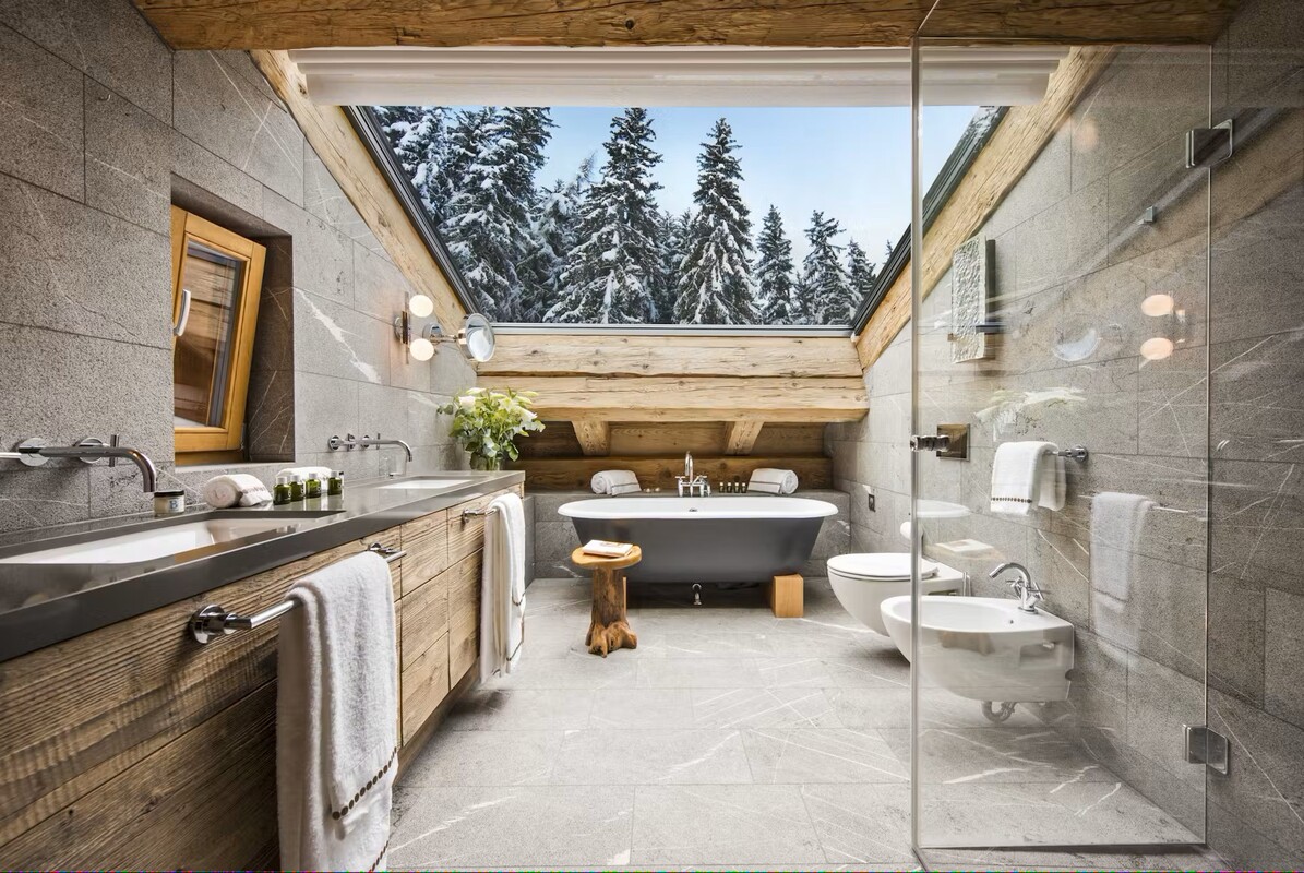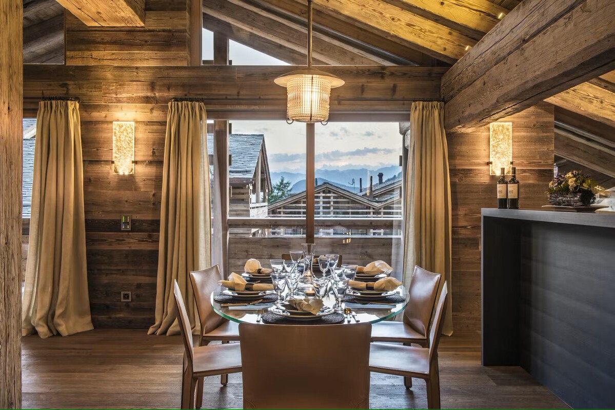 This luxurious property is decorated with a superb alpine chic feel. It has a very spacious feel with its double height living room area and open plan kitchen dining room. The sitting room offers a sumptuous sofa opposite a contemporary open fireplace. This main communal sitting room is lined with French windows opening out on to the south-facing terrace with amazing resort and mountain views.